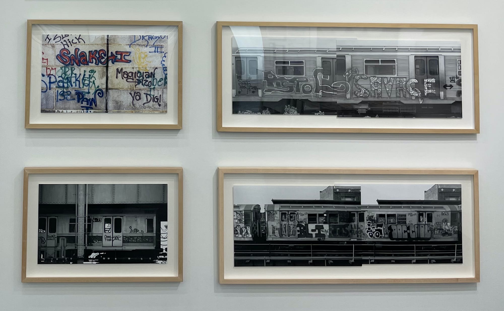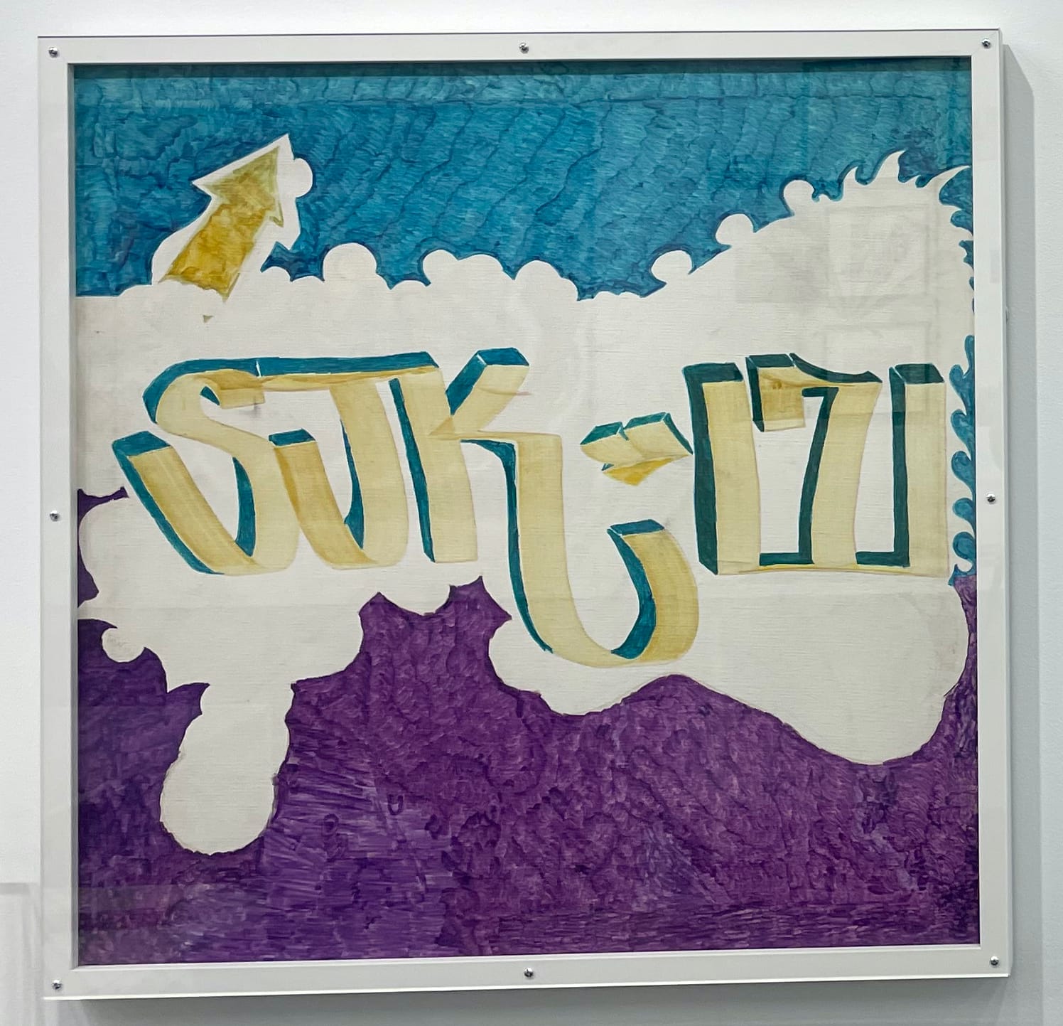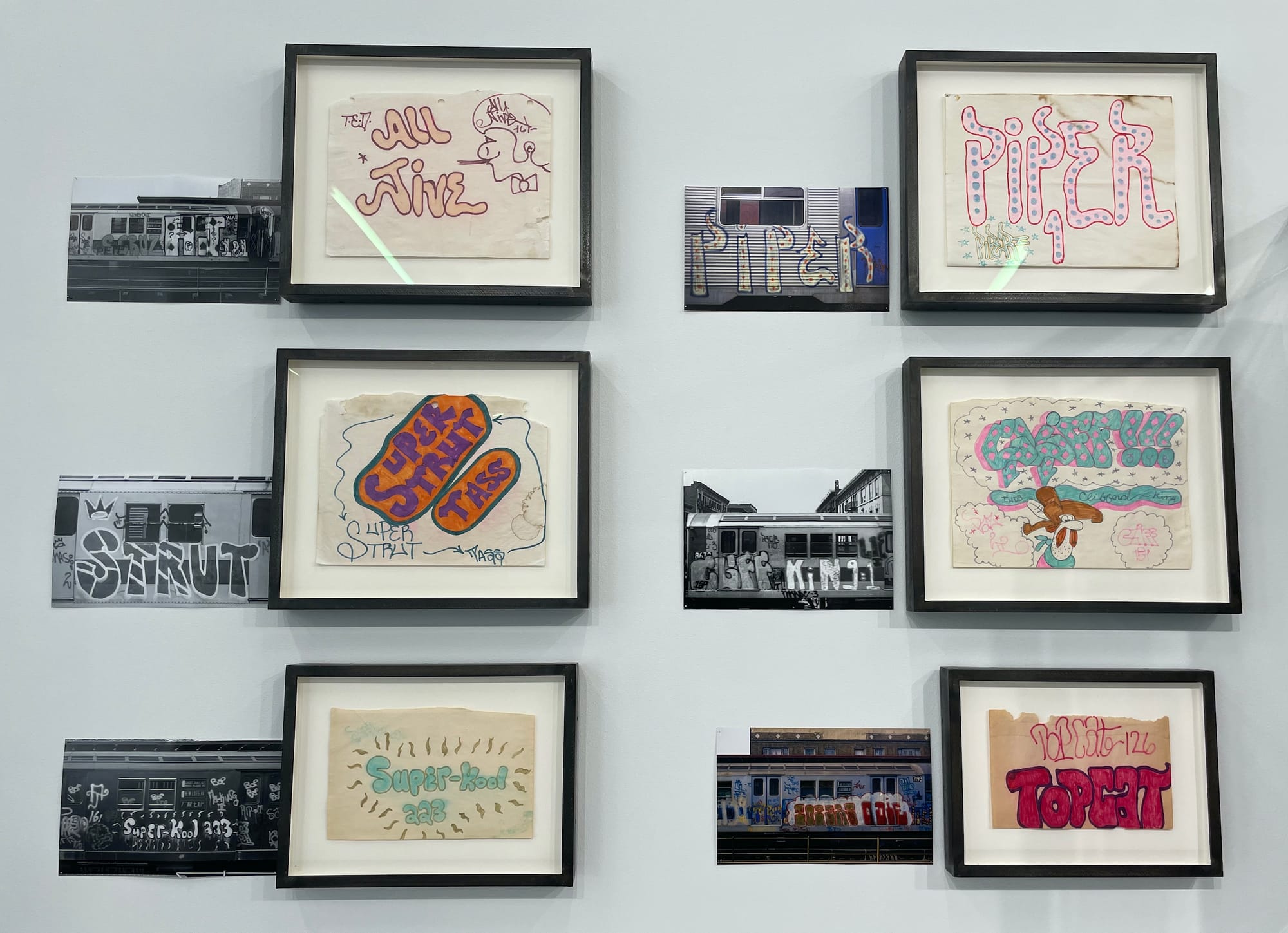 Didactics offer background on artists who were foundational to graffiti’s development as an art form, but didn’t become art world figures. One standout piece is an experimental marker drawing by SJK 171 (1973) that places his tag on a white cloud-like shape sandwiched between irregular sky blue and purple zones. The text explains that he was an original member of United Graffiti Artists (UGA) and documented his and others’ artworks early on. Likewise, visitors learn that Topcat 126 brought the influential “Broadway Elegant” style of writing from Philadelphia to Manhattan in 1971. The thick ruby red letters at the bottom of his 1973 drawing are incandescent.