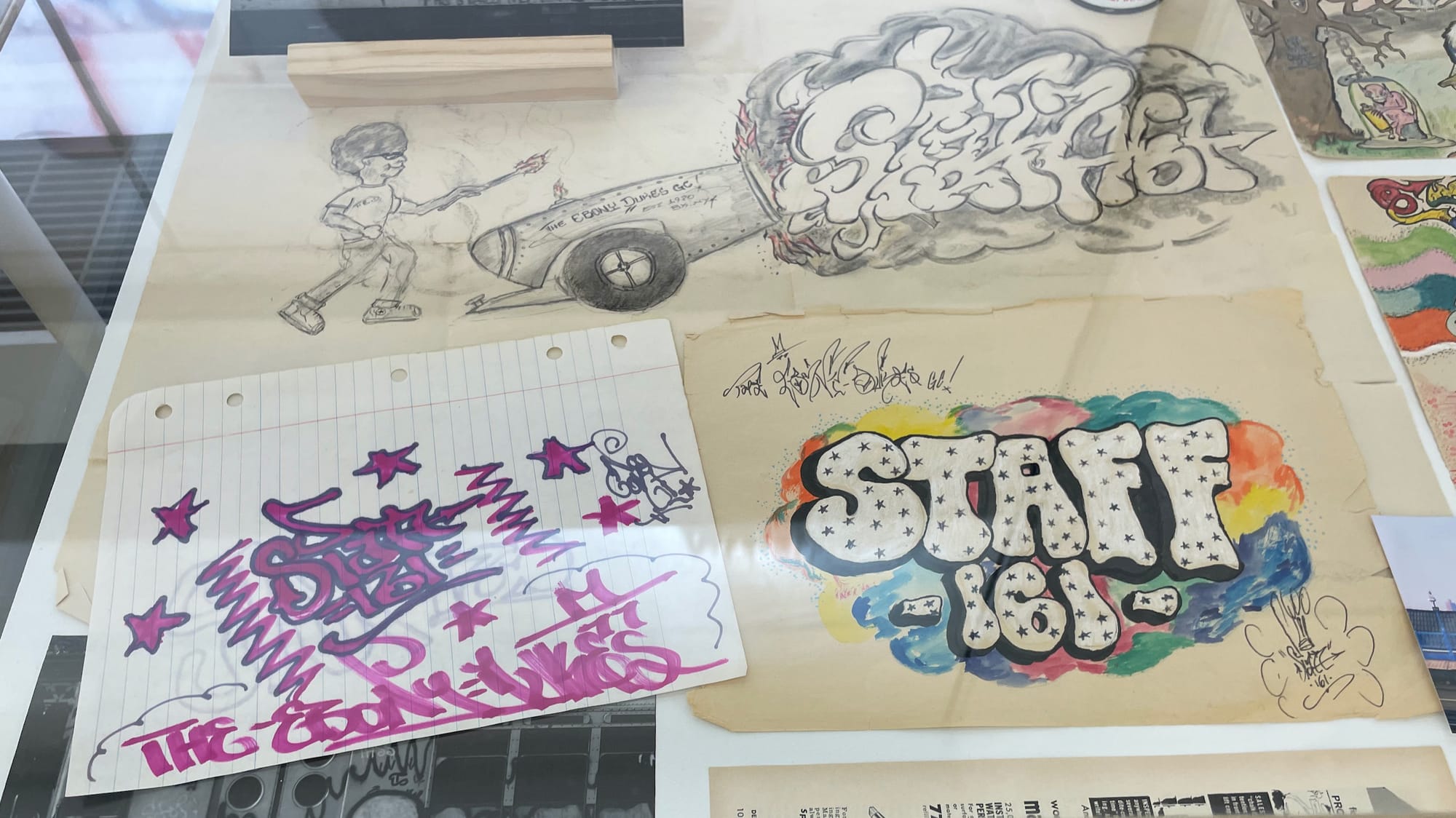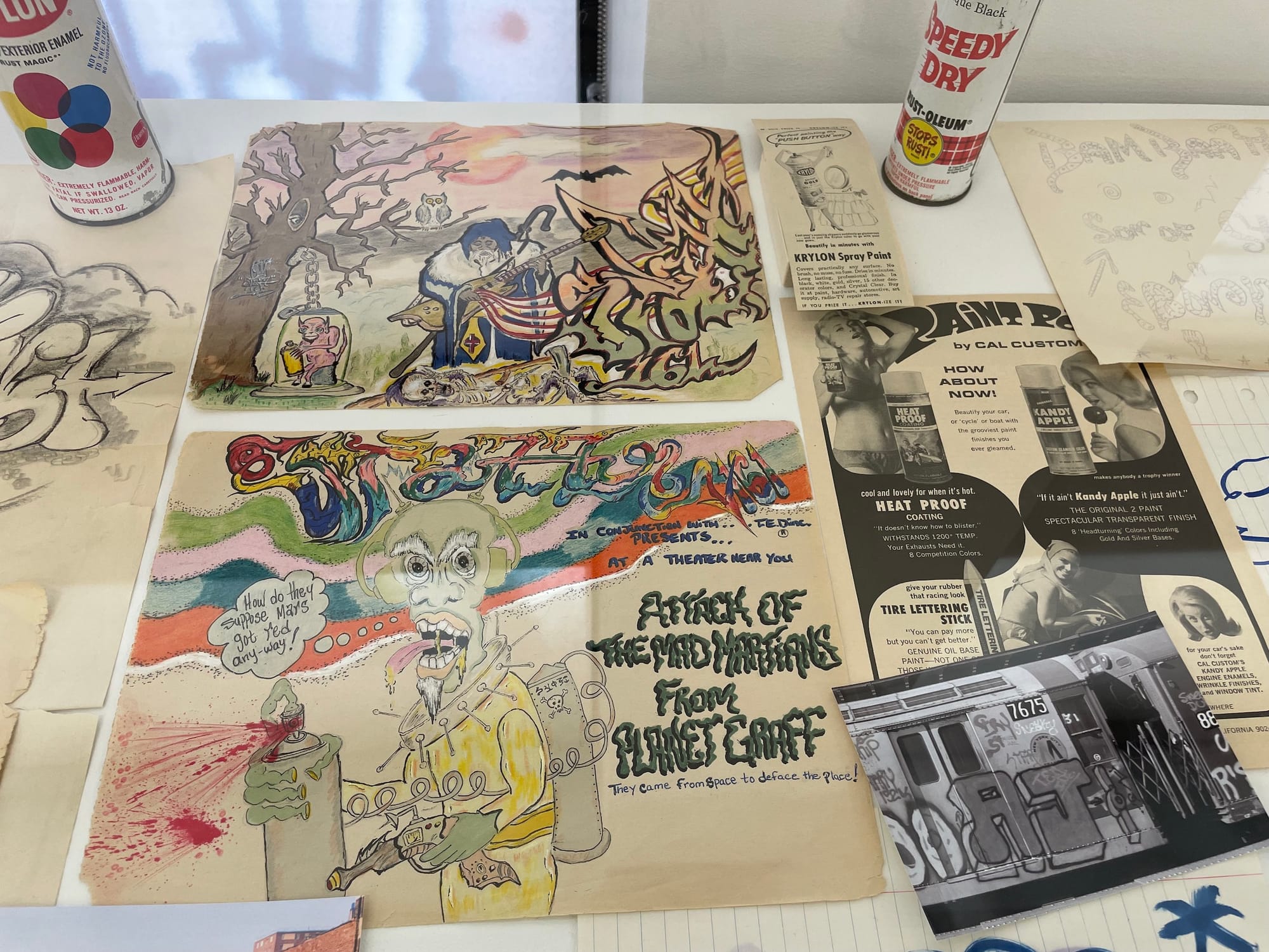 Vitrines filled with sketchbook pages, spray paint, and other items are even more intimate glimpses into the artists’ worlds. It’s these drawings, sketches, and paintings that make you feel like you were there.