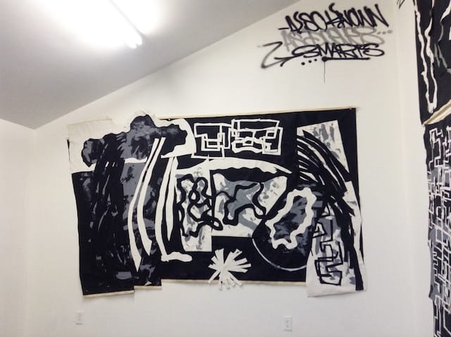 JS: Yes, and you work across the media: in addition to collaged paintings on unstretched canvases, you’ve done big murals in restaurants, hybrids of sculpture and painting: paintings stretched around armatures, and installations. What informed this kind of experimentation?