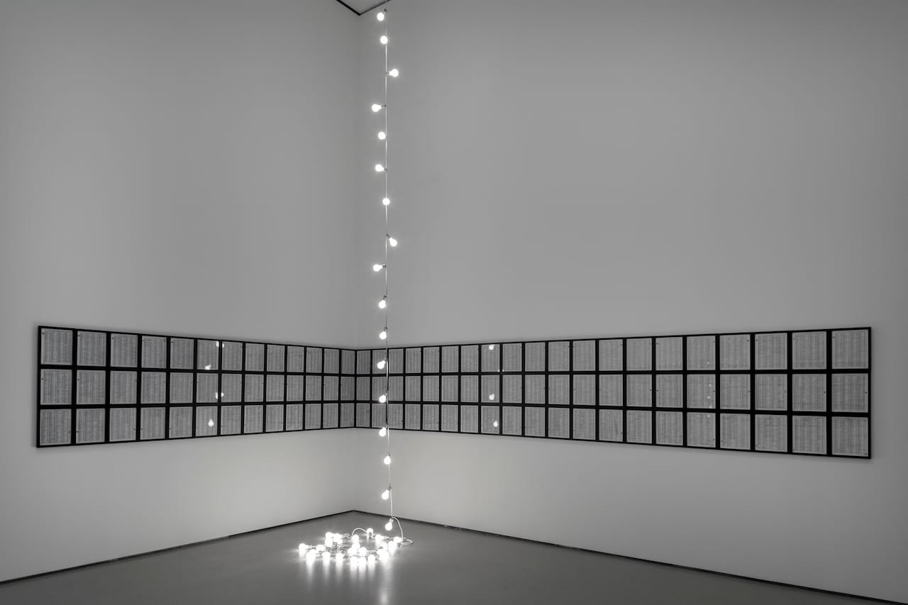 In the middle of the same room housing Camnitzer’s “Memorial” hangs Felix Gonzalez-Torres’ “Untitled” (Toronto) (1992), a string of light bulbs attached to the ceiling and trailing to the floor. Wrapped in associations of the AIDS epidemic, which took the artist’s life, the piece carries a particular potency in the relatively small room, shedding an unnaturally bright light on two very dark periods of recent history.