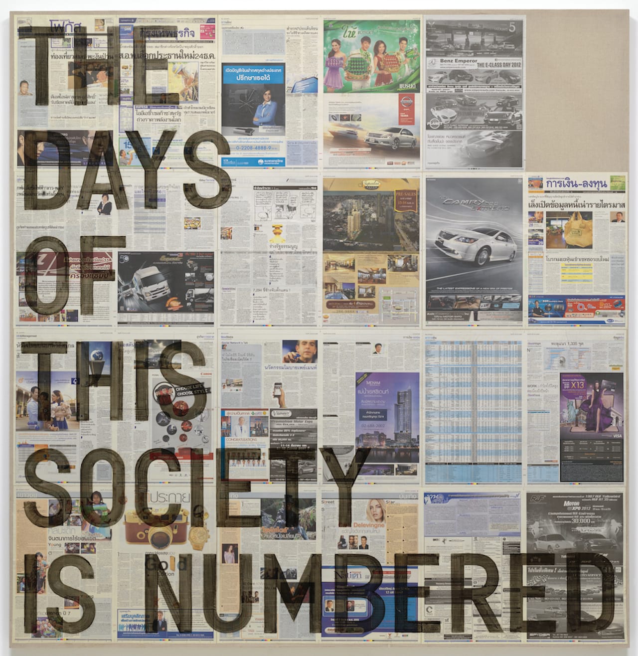 The opening room doesn’t bode entirely well, since the first thing that hits your eye is Rirkrit Tiravanija’s ungrammatically titled “untitled (the days of this society is numbered / December 7, 2012)” (2014), in which the eponymous, mistranslated pronouncement from Guy Debord is stenciled in capital letters across a grid of Thai magazine pages from the eponymous date — the 85th birthday of King Bhumibol Adulyadej, who has been on the throne since 1946.