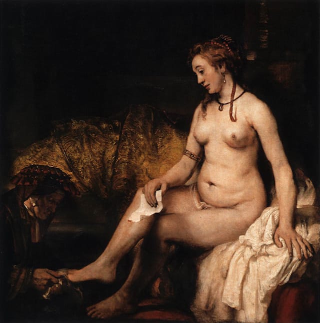 The exhibition is organized thematically, under broad categories such as “meditation” and “intimacy,” which at least do not interrupt the flow of looking and at best allow for interesting juxtapositions. “Bathsheba at Her Bath” (1654) for instance, is tussling with her conscience as she holds David’s love letter in her hand, near a fellow Old Testament figure, “Jacob Wrestling with the Angel” (ca. 1659). In both, the action looks as if it is caught in amber — Bathsheba trapped in her thoughts and her rich boudoir; Jacob lodged in the angel’s embrace as if it were a winged bed.