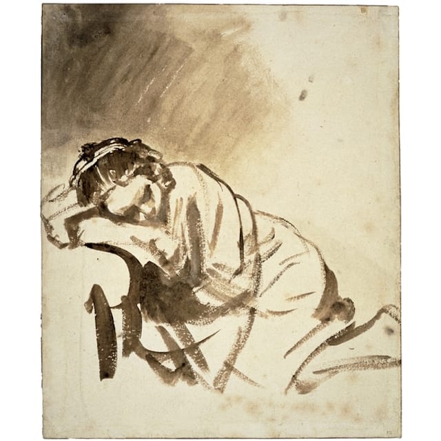Interspersed among the paintings are prints and drawings. In the drawings, Rembrandt mostly uses a reed pen, which induces a stiff, coarse line that he often overlays with an exceptionally dry-looking wash and white body color. These sheets, at times uncomfortably overworked (e.g., “The Three Syndics,” 1655), correlate to the dense facture of the paintings but have a harsh simplicity that feels like unfleshed bones. By contrast is a brush and ink drawing, “Young Woman Sleeping” (ca. 1654). Here the line is just as simple, but he allows the softness of the brush to evoke the roundness of the woman’s dormant crouch. The marks are dashed-off and abstracted, but they all make sense because of the representational force of the woman’s head: little pools of ink shadow the eyes and nose of the foreshortened face, but the greatest power is in the areas left white, like the forehead, its roundness miraculously suggested, or the narrow part in the center of her hair.