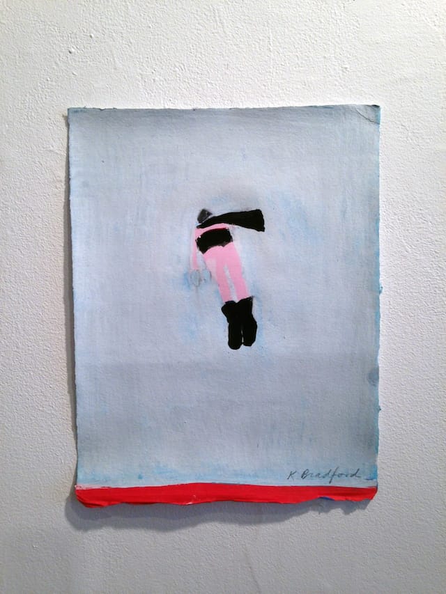 The result is a selection of work that is by and large as buoyant and trippy as Katherine Bradford’s “Black Pink Superhero” (2015), a black-caped, black-booted character in a pink leotard, catapulted into a pale blue sky. A border of scarlet gouache runs along the image’s bottom edge, which has the effect of solidifying the piece’s handmade paper support into a sculptural object.