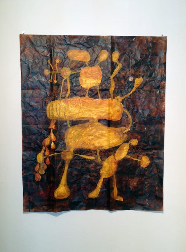 David Finn’s powerful “Weight” from 2013, a work in charcoal and shoe-polish-brown acrylic on a sheet of Tyvek (the ubiquitous polyethylene water barrier wrapped around new construction) that has been afflicted with innumerable folds and wrinkles. The texture of the surface disruptions lends the image — a network of swelling biomorphic shapes that looks like a space alien standing at attention — a three-dimensional presence, as the scattered light glancing off its glossy surface adds a layer of evanescence to the painting’s willfully awkward forms and brackish color.