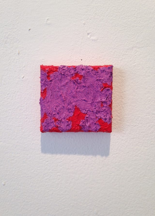 The untitled purple-and-red abstraction from 2014 by Sasha Pichushkin, a self-taught painter born in Orel, Russia, is tiny — only 3.5 inches across and 3.1 inches high — but it packs a punch. The textures of the purple strokes of paint are so dense and knotty that they seem to peel off the red field behind it. On the same wall, a similarly sized abstraction (3.5 x 3.5 inches) hangs beside a larger one (15.7 x 11.8 inches). Both are untitled and were made this year, and each feature downward-thrusting botanical forms resembling cherries on a stem. The smaller canvas is in deep purple and green on white, with smudges of pink, and the larger one is uniformly dark, with shadowy blues, blacks and grays over a field of umber, which is relieved by a rust-colored, quasi-diamond shape sliced into the lower right corner. They make a formidable pair.