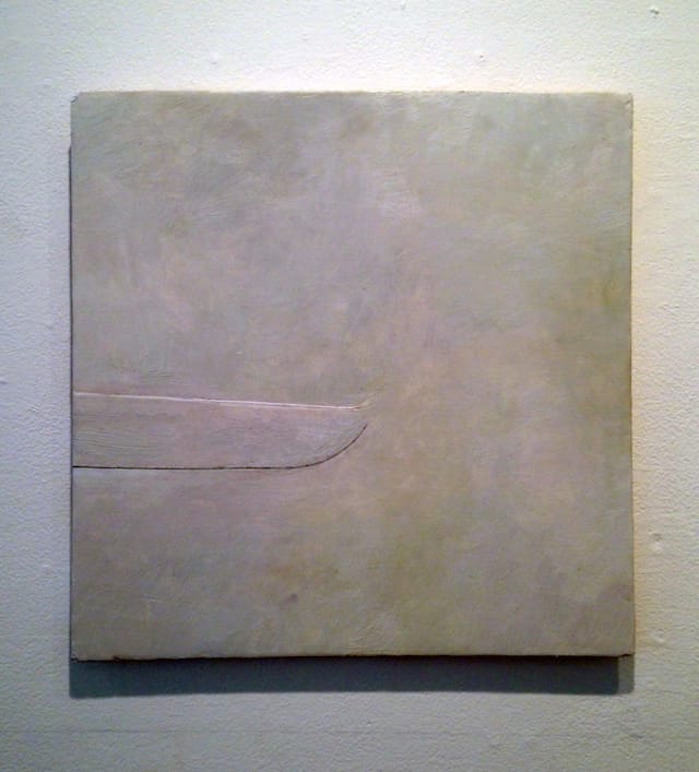 Blurring the distinctions between two- and three-dimensional artworks is a recurrent motif of the exhibition. Ellen Siebers’ untitled Minimalist abstraction from 2015 is an 18 x 18-inch gray square on a birch panel, with a blade-like buildup of paint (mixed with marble) that juts in from the left edge toward the center. The work is a painting, a drawing (the contours of the blade trace a filament-thin line around its shape) and a bas-relief, several identities residing in one.