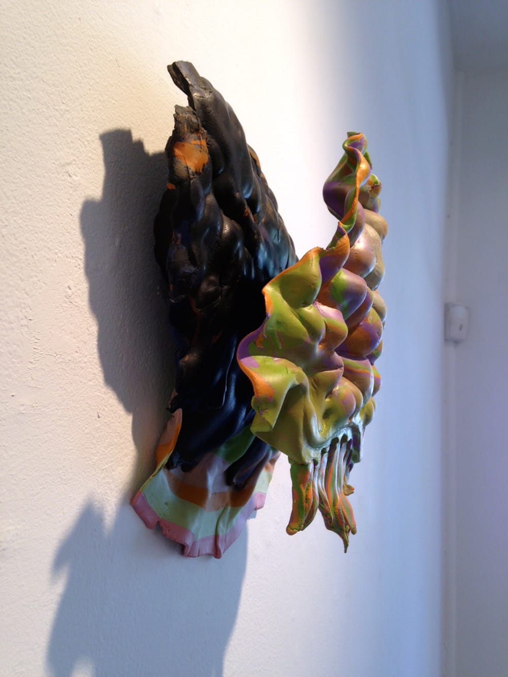 Daniel Wiener’s multi-colored works in Apoxie-Sculpt combine elements of sculpture, painting and process art. His wall-mounted, mask-like “We Go To Their Faltering” (2014) is an amalgam of colored bands (white, green, orange, purple and ecru) that are fashioned into a puckered surface, which is thrust forward from an arching, mostly black shape behind it, and adorned with fanged protrusions along the bottom edge. Its sci-fi/horror vibe invokes the kind of monstrous life forms that have been imagined floating around the cosmos, as well as the monsters floating around the deepest levels of the ocean, where life on Earth most likely began.