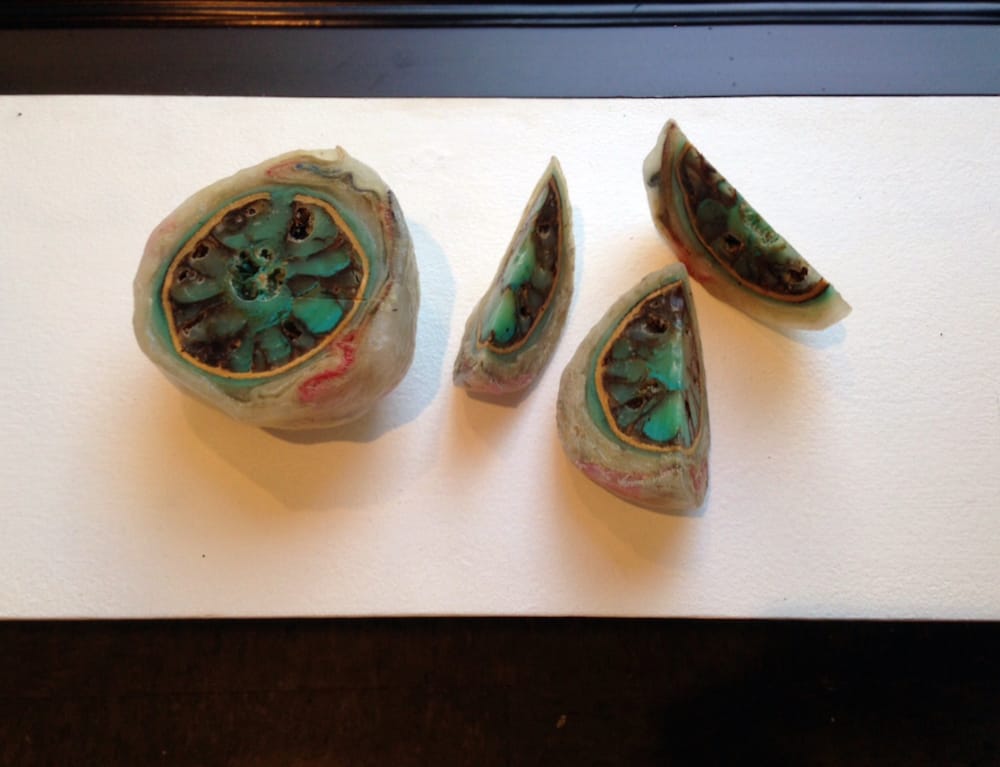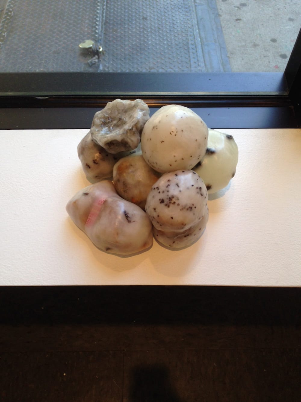 The sculptures of Ye Qin Zhu, who was born in Toishan, China, and currently lives and works in Queens, are laid out on a shelf along the sill of the gallery’s front window. They are evocatively lumpen forms that bring to mind protozoa, fungi, geodes and coral. The artist’s technique is straightforward — covering items from everyday life in wax, including cut-up strips from old paintings, a piece of black crochet, sawdust, chrysanthemums, houseflies and wasps, a cooked potato and a dried orange, and then using them to build layer upon layer of color and texture — a multifarious approach to Jasper John’s dictum to take an object, do something to it, and then do something else to it. These are remarkably assured and eerily beautiful works that embrace the embalming nature of the wax to create oozing, wriggling, bulging, eruptive forms, a kind of alpha and omega, recycling life out of death. Calvino would be pleased.