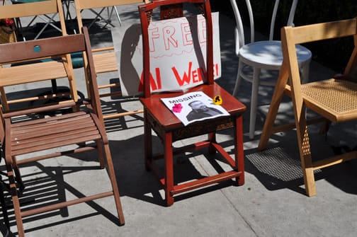At 1 pm EST today near the Chinese embassy in Manhattan, out by the water at 520 Twelfth Avenue, a congregation of chairs gathered. Members of the city’s art world, community members and human rights activists came out in force, to the tune of a few hundred, to protest for the release of Ai Weiwei, the internationally-famed artist who has been detained by the Chinese government for the past two weeks without charge.