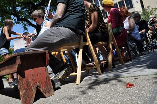 Protesters hold up signs and chairs.