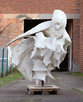 The new ‘colourless’ sculptures with an elegant silhouette withstanding the resemblance of a bird transform and “peel” within the sculpture to an abstract skin reminiscent even of the perforated canvas of Enrico Castellani; the Italian artist who in the wake of the zero movement attempted to escape the obligation of formal categories and labels.