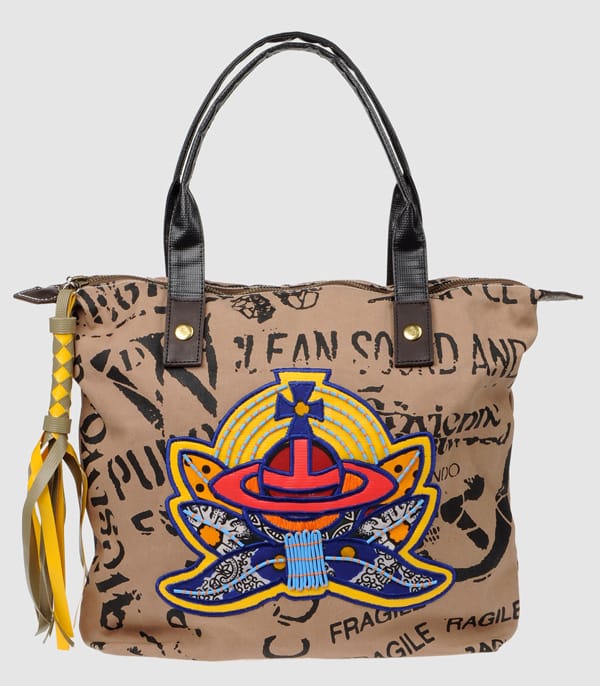The bags’ designs still fit perfectly into the Westwood mold; they’d look right at home hanging beside pirate squiggle shirts and alien jackets at her World’s End shop on Kings Road. The bold graphics utilize the designer’s signature iconography: eagles, monkeys, clocks, the slogans “Too Fast To Live, Too Young to Die” and “Let it Rock” as well as her iconic orb emblem, of course. The bags have a fun, pop-ethnic feel and a reasonable price point ($49-$339), given that they’re not factory-produced.