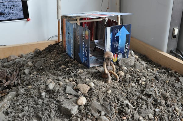 Rossa Cole (aka Point Green Pictures) makes sculptures out of trash and twigs. Here, he’s created a shack using credit cards that lives off the grid and steals power (his words).