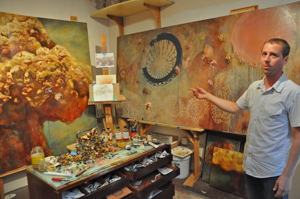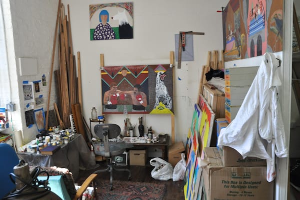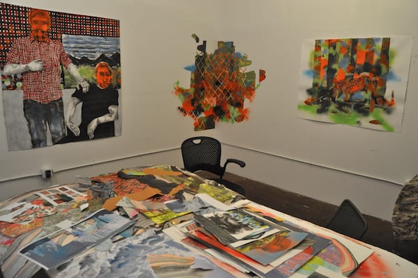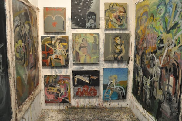 A view of Todd Bienvenu’s studio of painterly chaos.