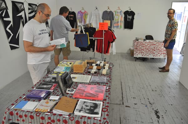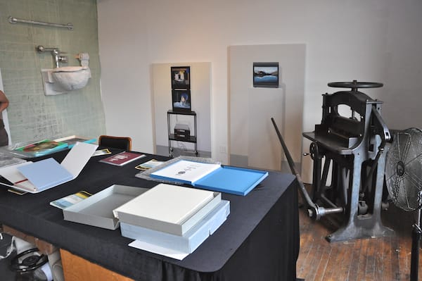 A view of Booklyn’s gallery space with an assortment of prints and publications, including an old-style press and a toilet made out of paper-mâché (complete with unflushed turd).