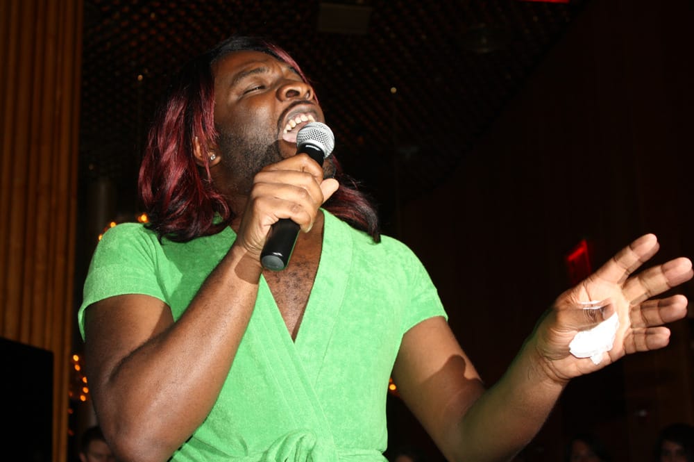 The video series and complimentary periodicals were not the only source of attraction, however. James Franco muse, General Hospital star and featured artist Kalup Linzy performed three songs, including the bubbly, hip-pop “Chewing Gum.” Clad in a short, avocado terrycloth robe and occasionally wiping the sweat from his brow, Linzy brought his own video art to life in front of an adoring crowd.