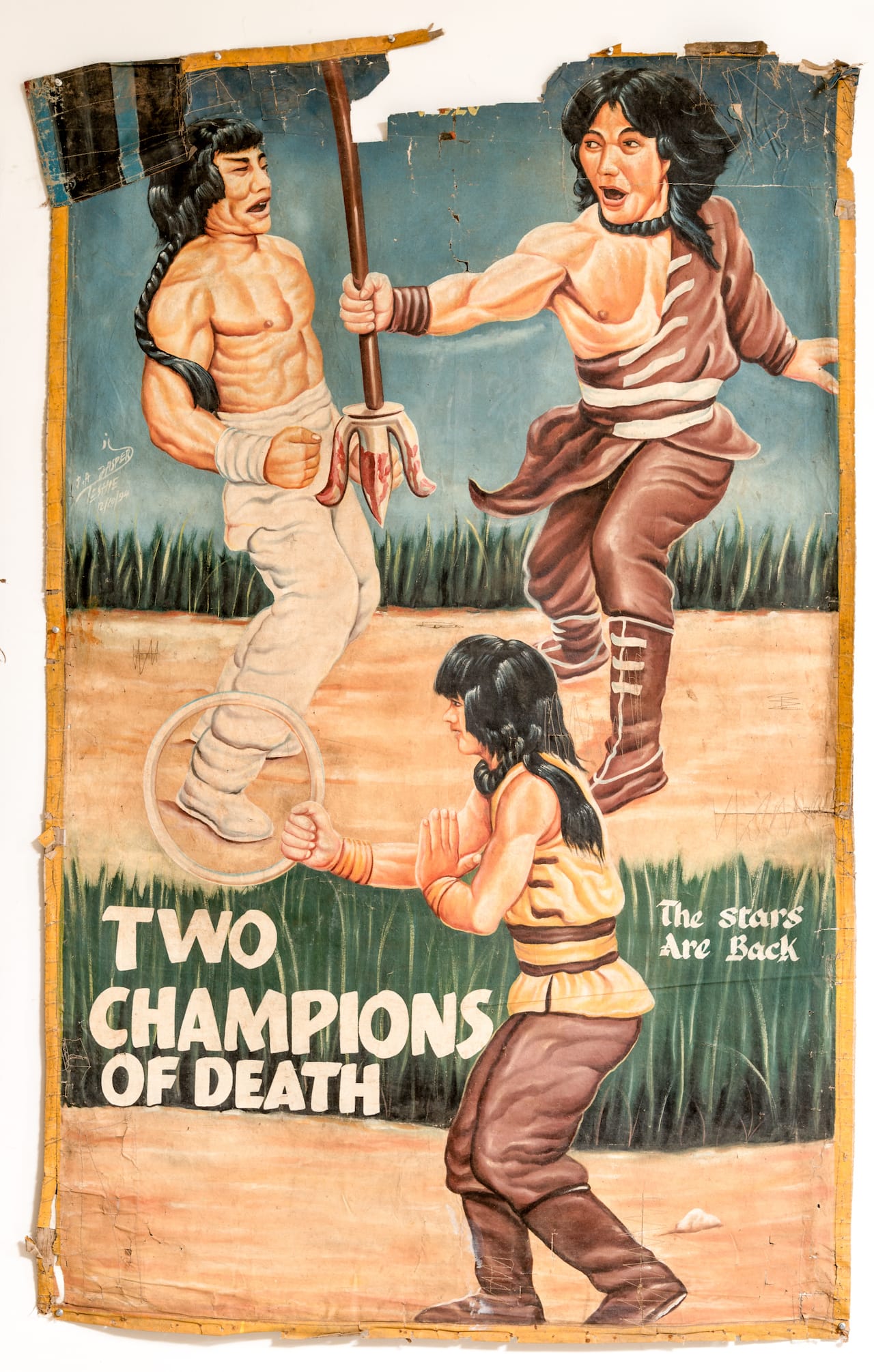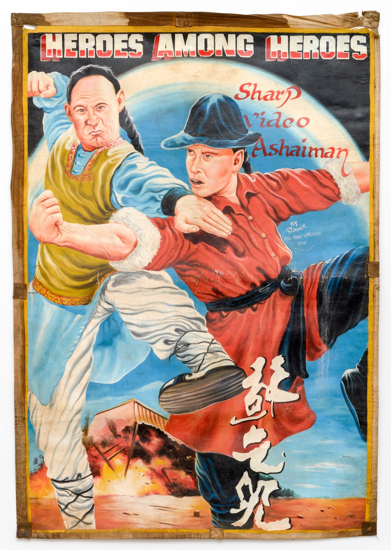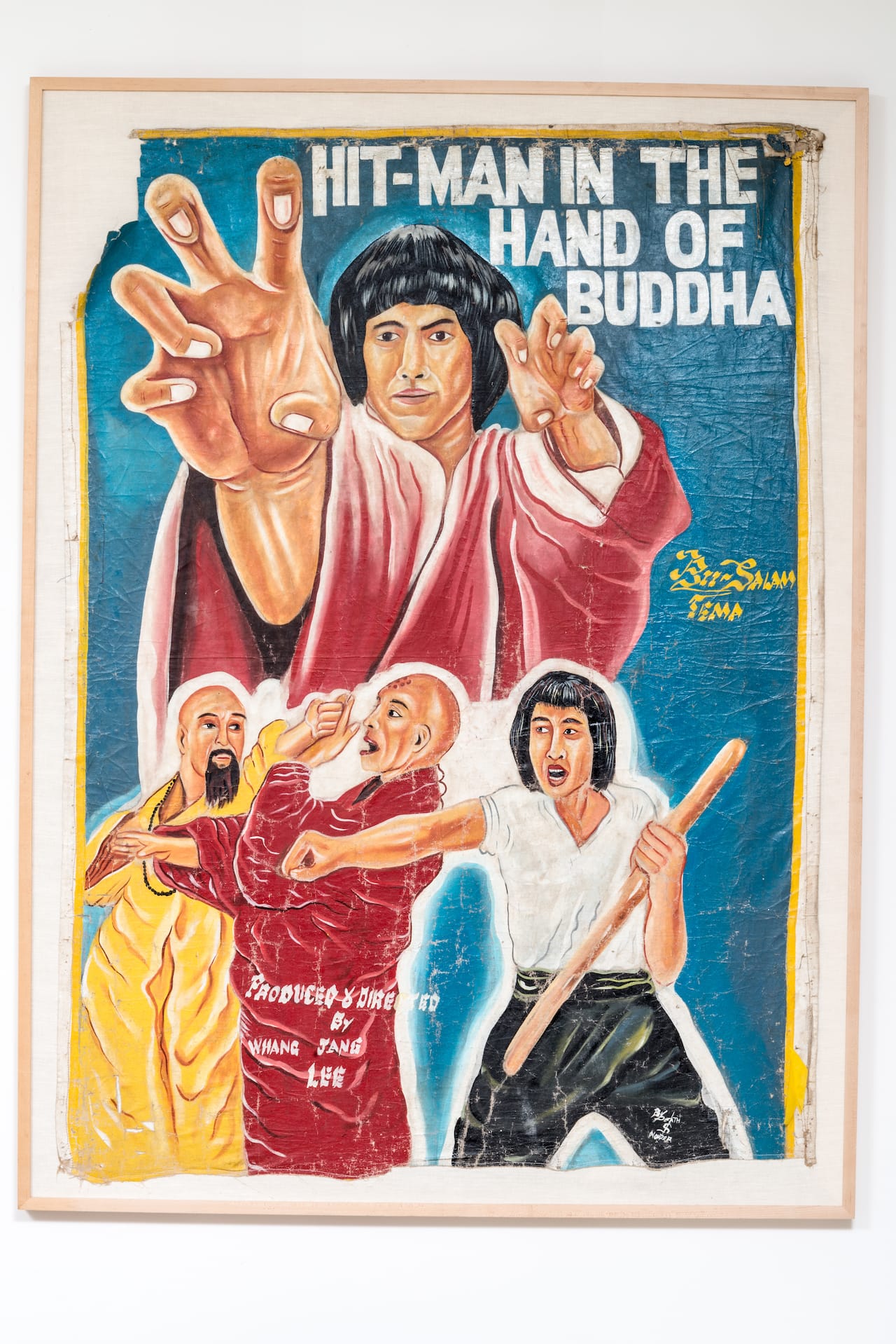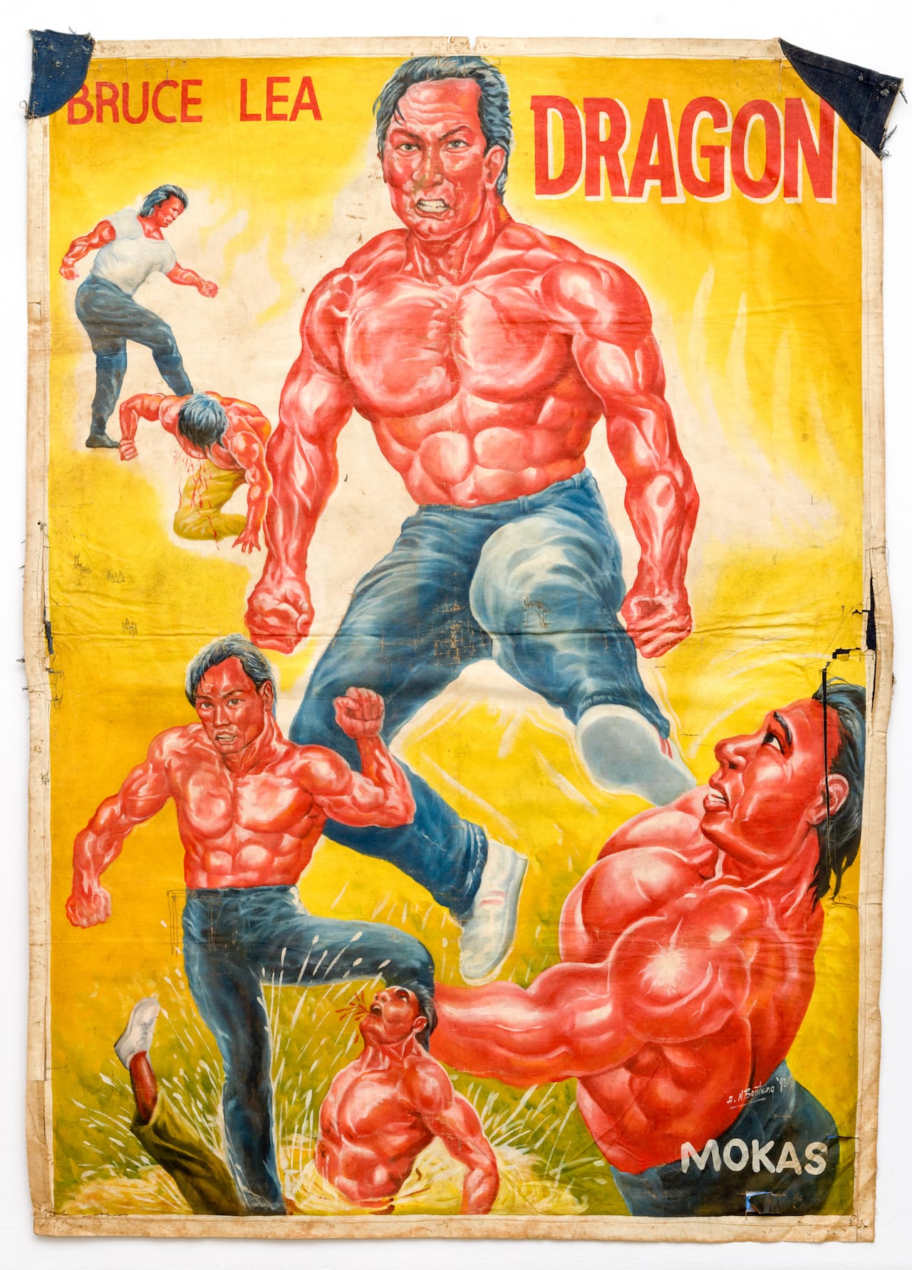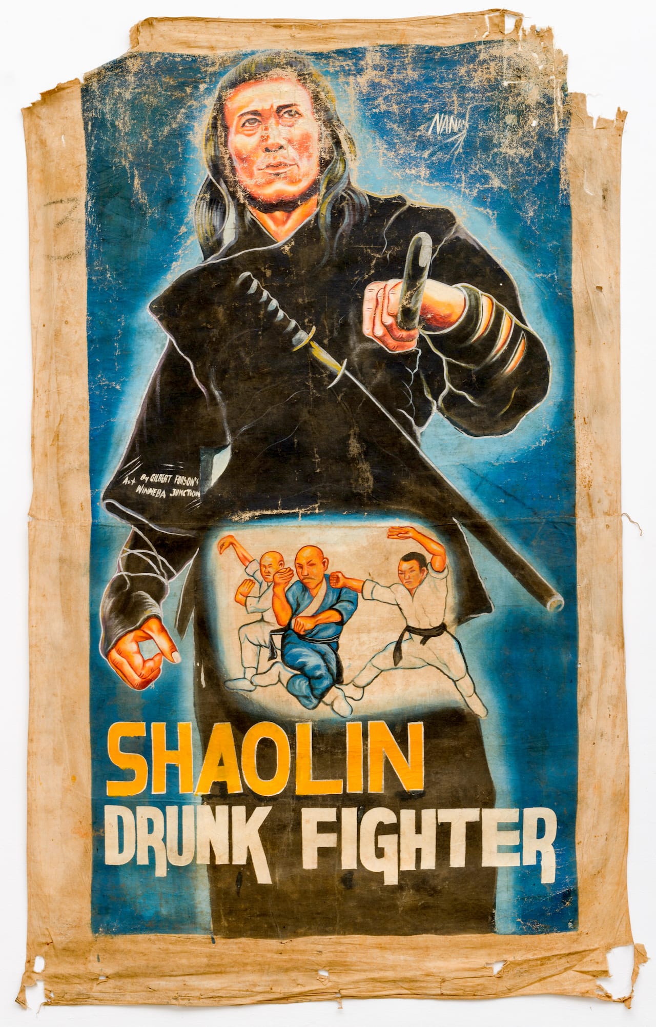 In the 1980s and ‘90s, a vibrant new art form proliferated in Ghana: Kung Fu movie posters painted by self-taught artists on recycled flour sacks. Known locally as “crowd-pullers,” these posters advertised the only variety of cinema available in much of the country, parts of which lacked an electrical grid — mobile screenings of VHS tapes in vans with gas-powered generators. These were hosted by entrepreneurial traveling film fanatics. West African audiences were particularly enamored with Kung Fu flicks coming out of Hong Kong, like Jackie Chan’s Hand of Death, Bruce Lee’s Exit the Dragon, and Jet Li’s Master of Shaolin. Trained in a loose master-apprentice system, sign-painters decorated the Ghanese landscape with their fantastical portraits of Jean-Claude Van Damme, Jackie Chan, Bruce Lee, Jet Li, and other martial arts stars.