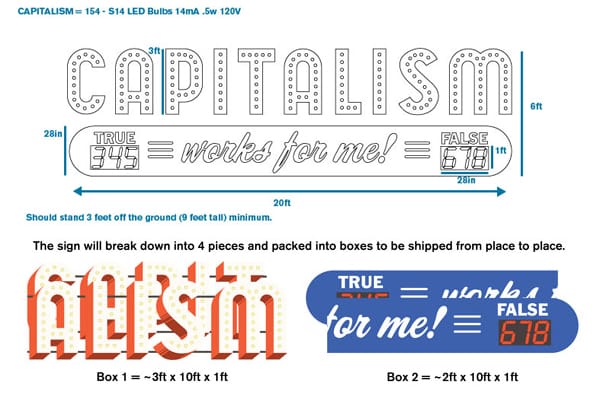 To fix the situation, Lambert is proposing a mobile polling station, built around one of his signature custom-built signs, that will make appearances in cities across the United States and which will ask visitors to answer true or false to the simple statement “Capitalism works for me!”. An electronic counter will keep tally of the respective votes and the voting mechanism will be programmed with a 30 second delay between votes to allow participants the chance to discuss their points of view and ideas for reform.