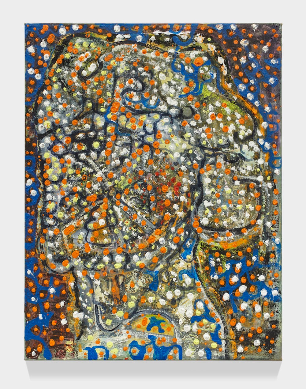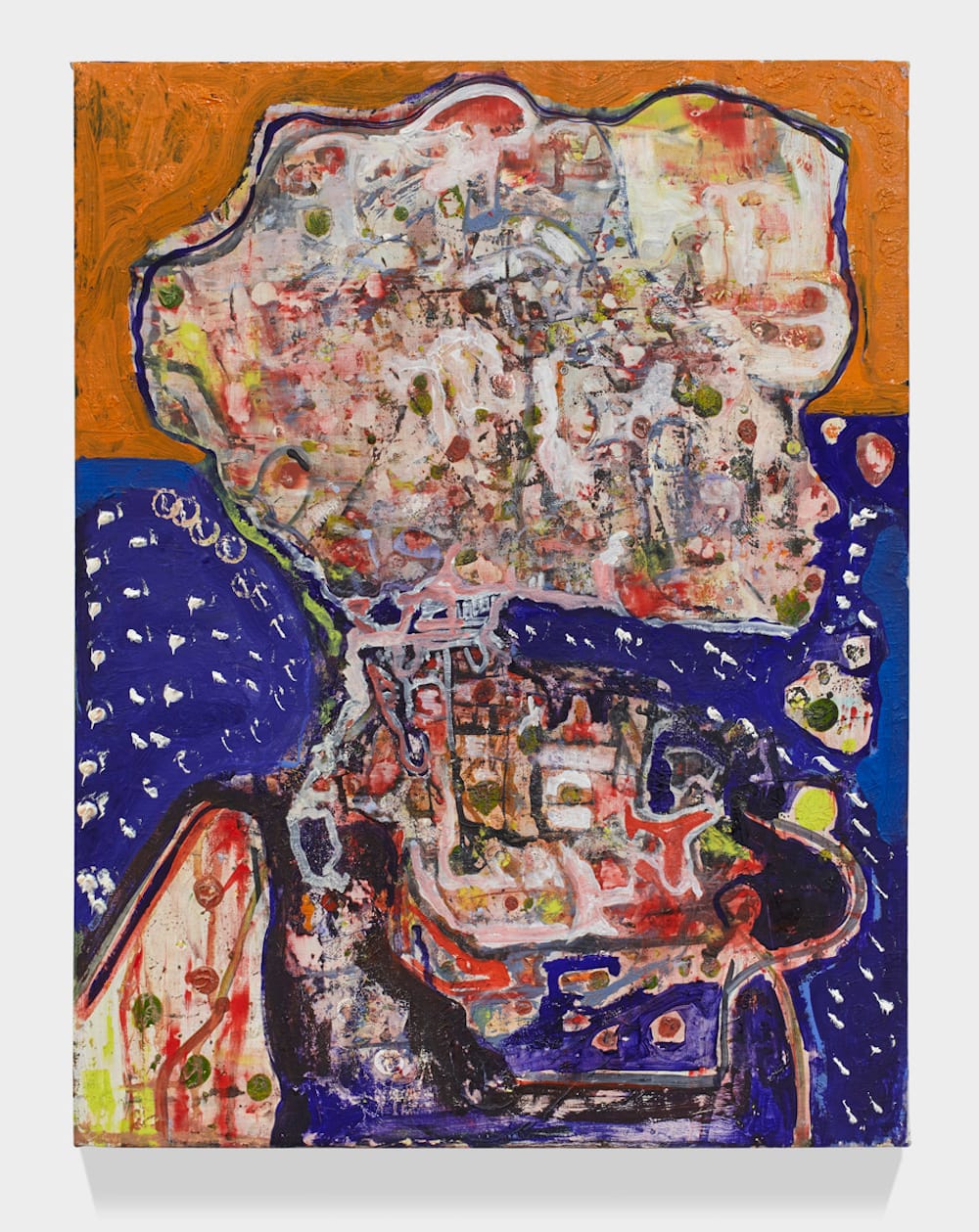 In “Quantum Goat” (2015-2016) – aren’t DiBenedetto’s titles great? – the evidence suggests that he arrived at a head-like form in profile, rising from the painting’s bottom edge, and taking up nearly the entire surface, through the manipulation of the paint layers. Had the artist stopped there, he would have been left with a fusion of image and scarred surface of the same order as “Stone Wash Freezer Burn.” Instead, he covered the painting with a field of orange, white, and yellow-green dots, which seem to have been squeezed directly from the paint tube, resulting in a surface covered with pustule-like outbursts. Finally, he applied a thin layer of blue, mostly in the areas surrounding the head-like form.