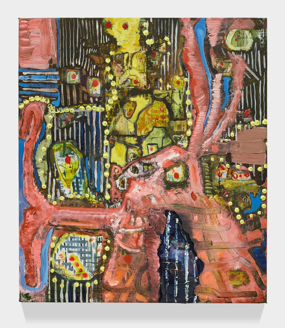 On a formal level, “Quantum Goat” is an argument between a figure-ground configuration and an all-over field of colored dots, as well as a melding together of the two into a buzz at once optical and visceral. But “Quantum Goat” is much more than that. There is the dialogue between the slowly painted figural form and the abstraction of the quickly applied dots, between deliberation and impulsiveness. Is the form being attacked by a swarm of midges in the guise of paint? Or are they eruptions – signs of internal disorder – bursting from the painting’s surface? If the figurative form and the all-over field feel like historical choices, DiBenedetto’s fusion of them feels fresh and unexpected, even startling.