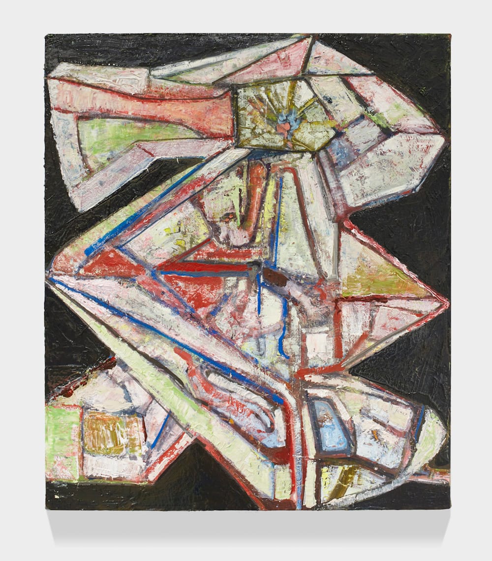 It should also be said that “Stone Wash Freezer Burn,” with its merging of viscous paint and a clearly demarcated angular shape, is the least dissonant composition in the show. “Stone Wash Freezer Burn” is – to use a musical term – a melodic painting where everything fits tightly together, endowing the image with a sense of order. At the same time, the scraped surface, the ridges of scarred paint, imbue the compositions central crystal-like form with a feeling of melancholy, as it registers time’s corrosive power.
