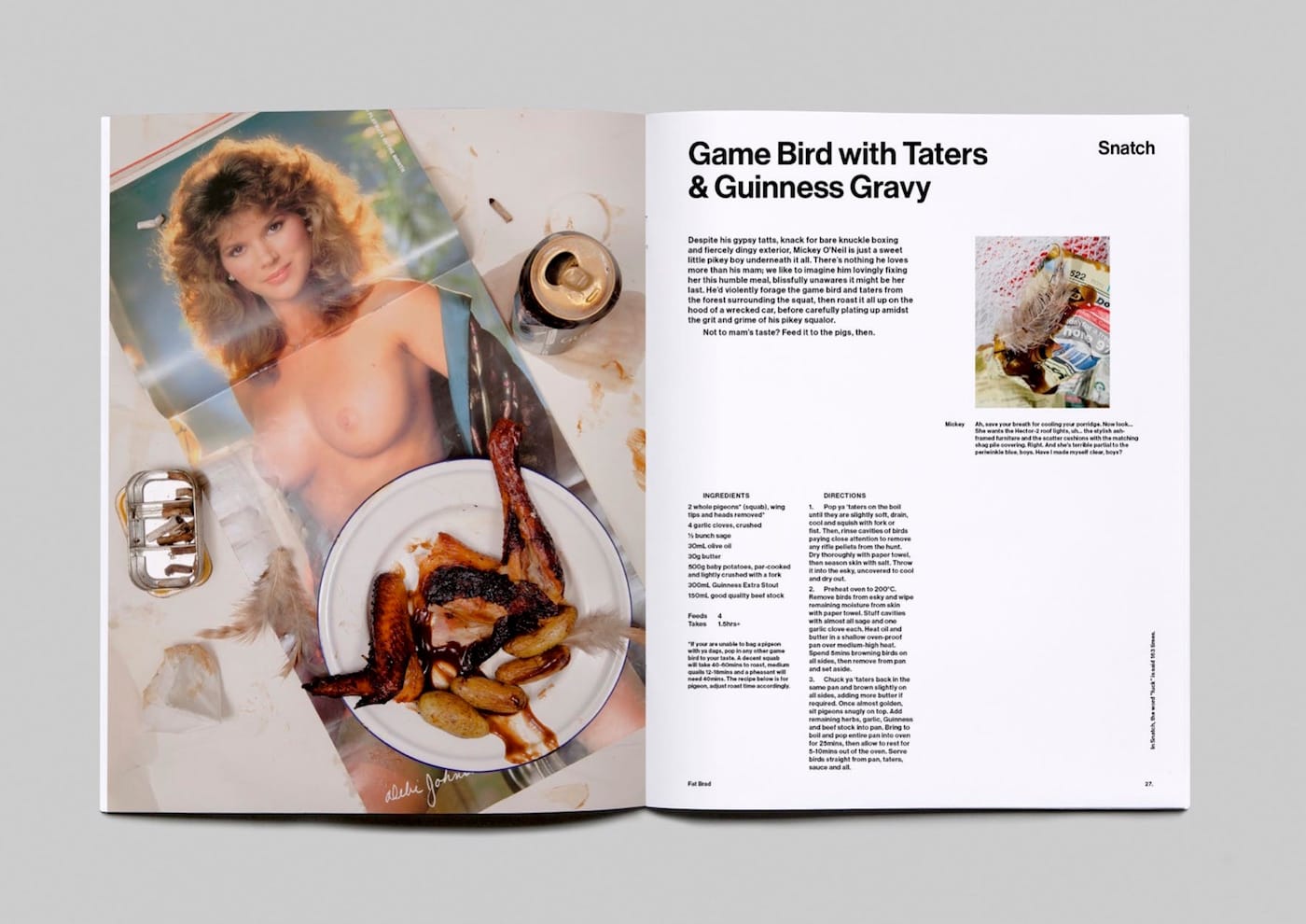 The book reads like fan fiction by a preteen girl on MasterChef Junior. Chefs Ali Currey-Voumard and Mietta Coventry recreated 50 dishes that various Pitt characters eat, from Tyler Durden’s seafood bisque in Fight Club and Rusty Ryan’s carpark burger in Ocean’s 11 to the “Game Bird with Taters and Guinness Gravy” Mickey O’Neil enjoys in Snatch. Ben Clement‘s photographs of the artfully messy dishes are food porn of the highest order.