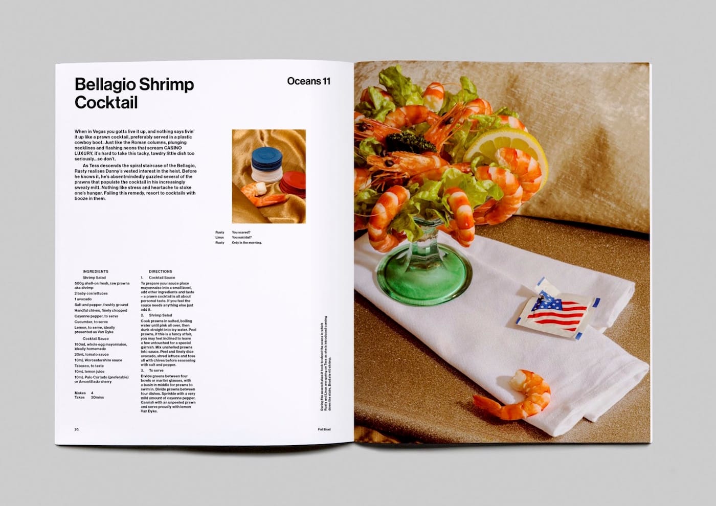 “We loved the brilliant disparity between Brad’s on-screen penchant for shitty food and his god-like body,” Fred Mora, one of the three founders of Long Prawn, told It’s Nice That. While the cinematic photos serve as wry commentary on American gluttony and celebrity worship, the recipes are totally legit, tested by top chefs, and not the sort you’ll want to burn after reading.