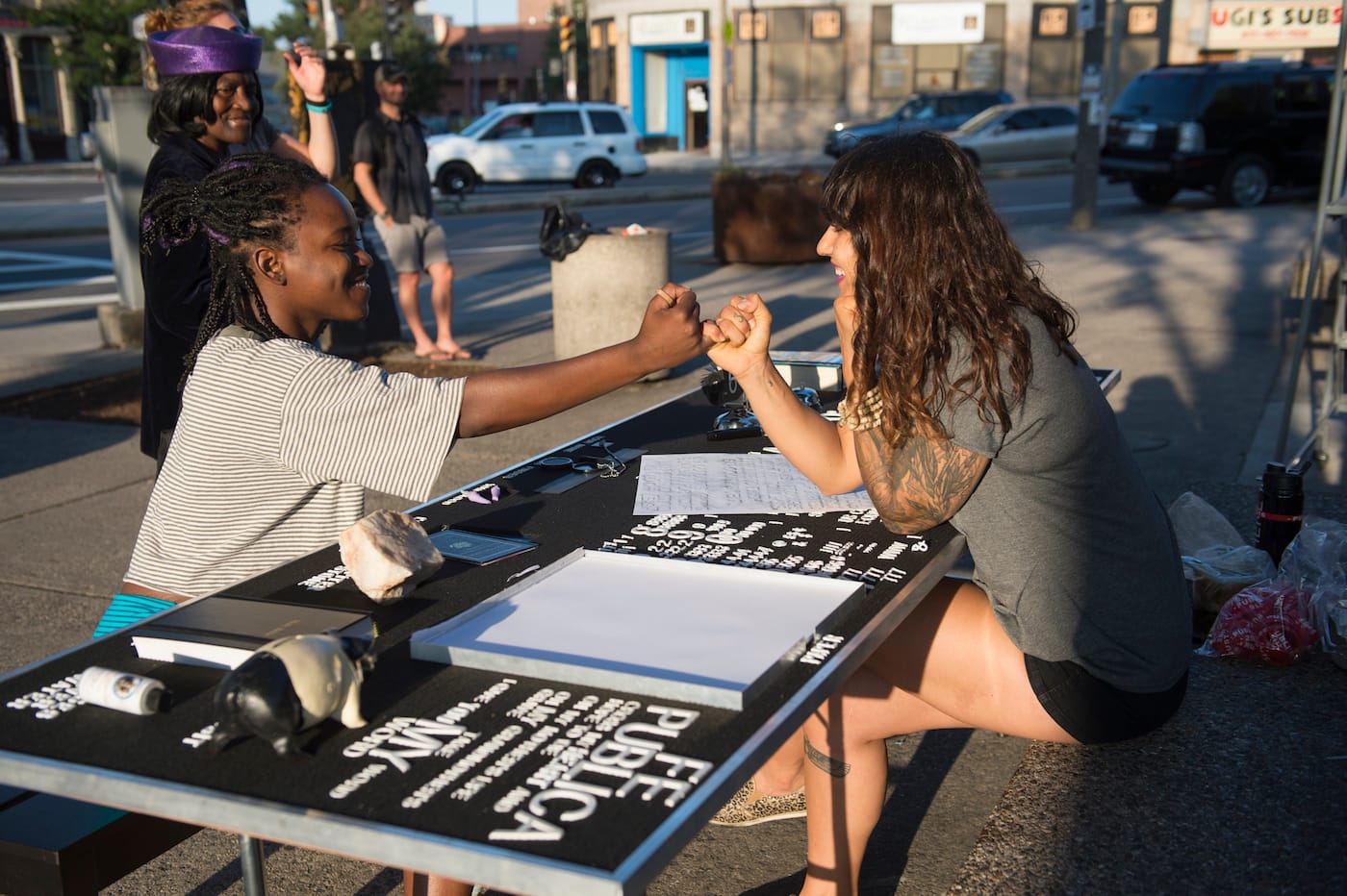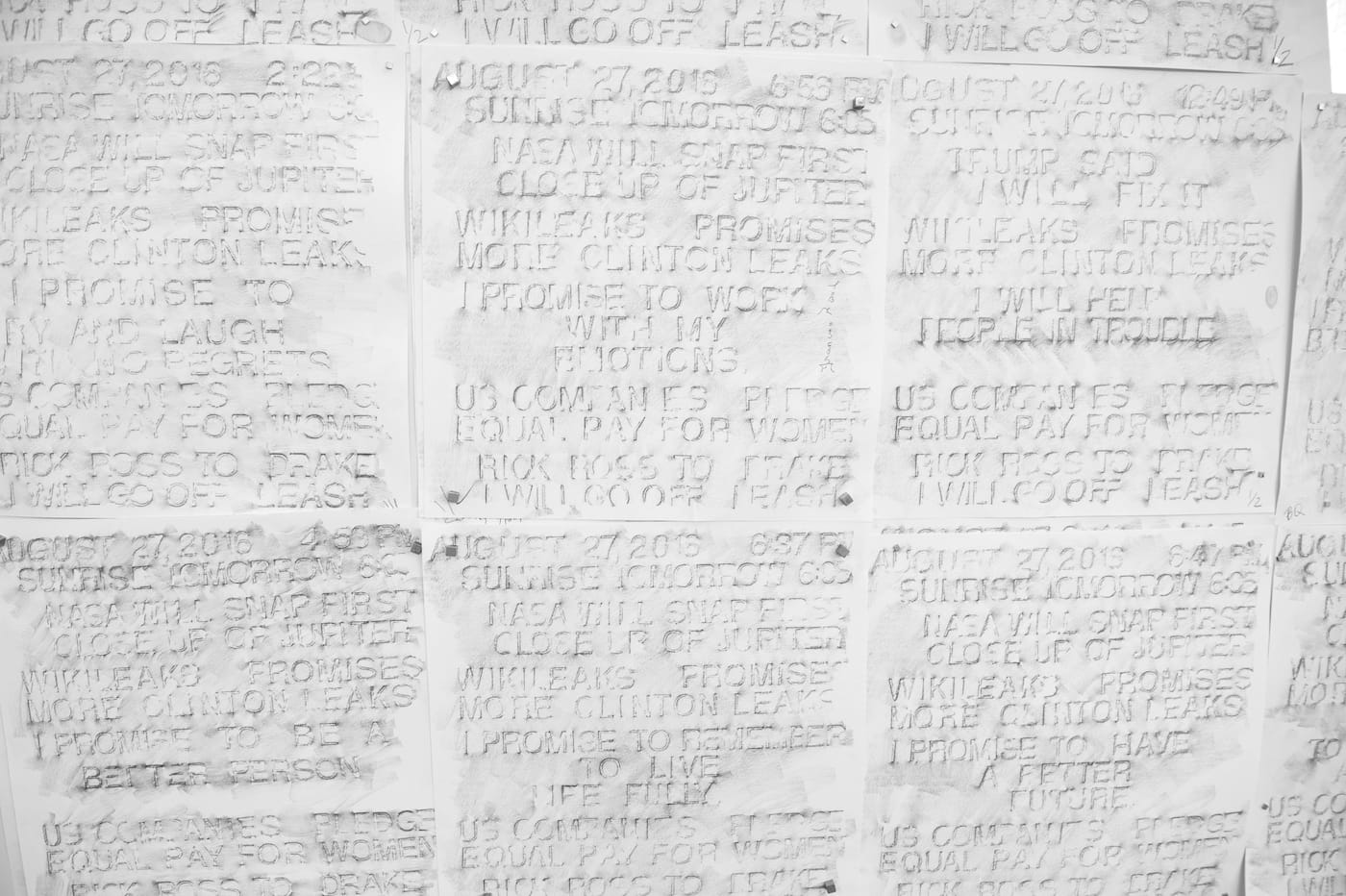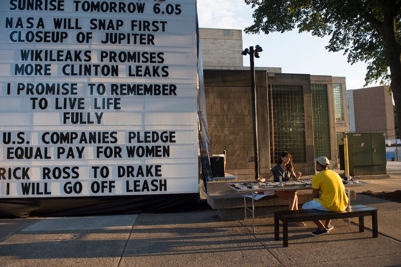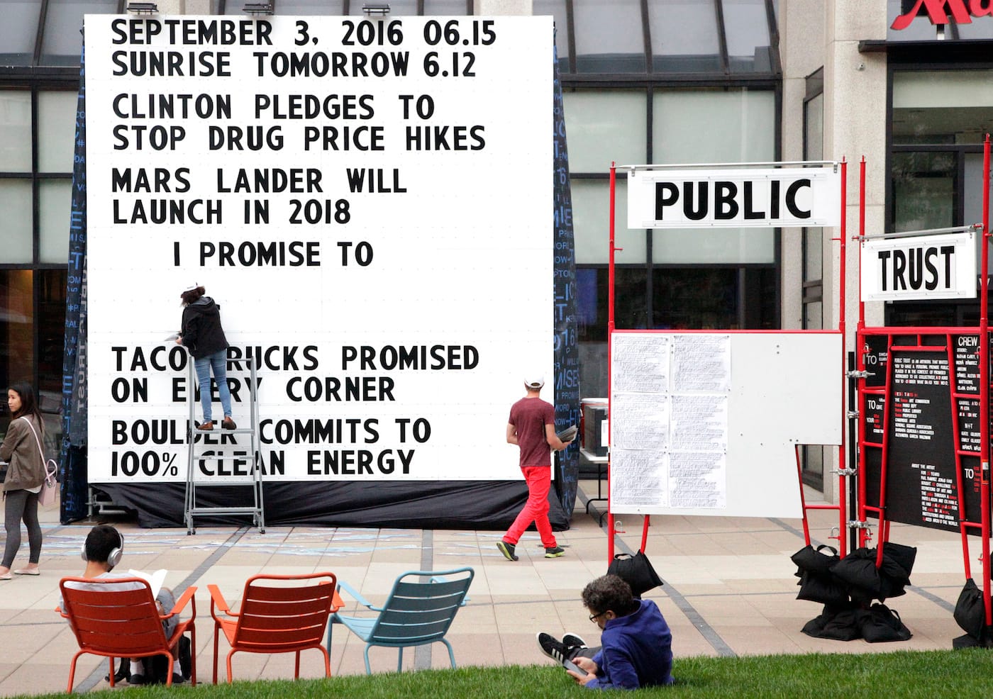 While the public’s words are the substance of Public Trust, the physical props underscore the fragility and impermanence of promises: the large billboard is propped up with scaffolding, while the table and signboards are all made from felt letter board. The project’s black and white palette highlights the unequivocal solemnity of oath making; the only areas of gray to be found are on the chalk rubbing contracts. However flimsy, the participants, and all those who believe in public trust, put faith in the stuff of this system even as their ideas and words are erased. Consequently, Public Trust mimics the reality of the democratic order, where people collectively place power in public figures every four years. Through the simplicity of words, signs, and scores, Jonas keeps the promise of the social contract present.