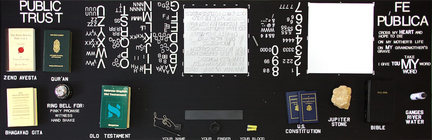 The performer makes two copies of a chalk rubbing of the promise; one for the project, and one for the participant, who must sign both with a signature, a fingerprint, or a drop of their blood. Afterward, the participant swears by an object of their choice — a Jupiter stone, Ganges River water, religious texts — with the performer as a witness. A bell rings when the contract is considered complete, and another performer translates the promise from the contract onto the billboard in big, blocky sign letters. Participants then have the option to have their photo taken (with their bill boarded promise), by Now and There, the nonprofit producing Public Trust.