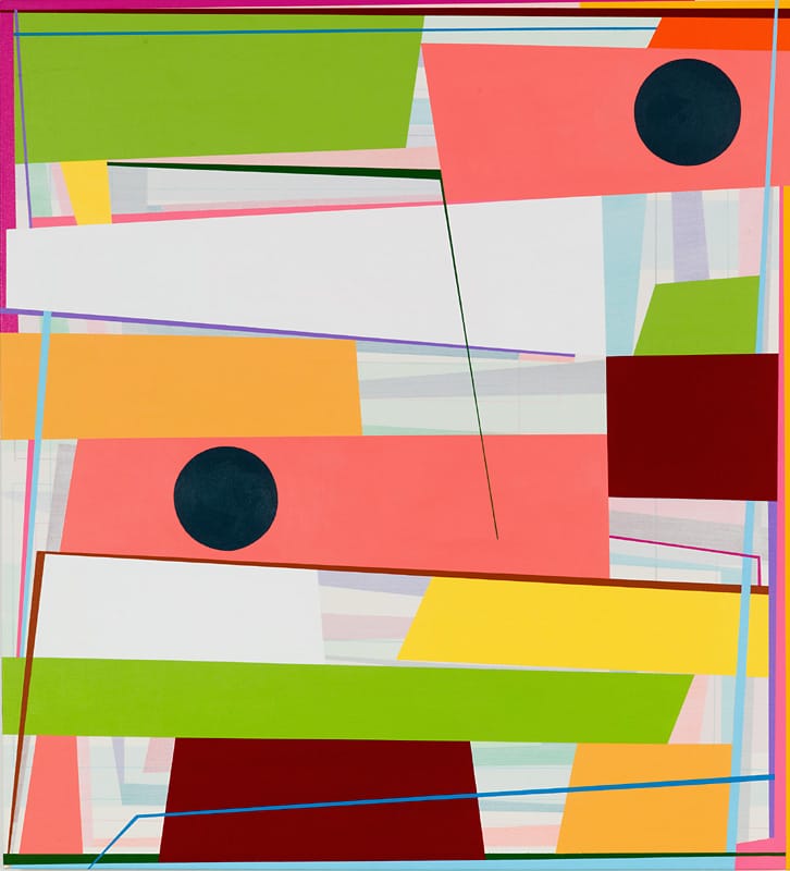 The comic calm with which Petersen’s shapes accept their rickety situation holds our attention. In counterpoint to the wobbly stacks, he uses color as a scaffold to hold the forms in place, while infusing them with a rhythmic musicality that is both harmonious and dissonant.