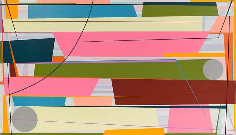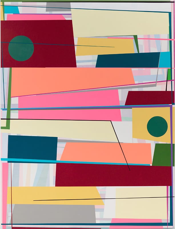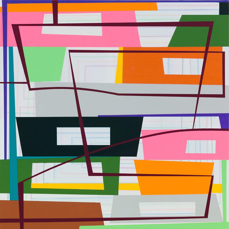 Petersen is a hard-edge geometric painter whose groupings of color and stacked forms seem inspired by Ellsworth Kelly, Al Held, and Nicholas Krushenick — distilled shapes, impossible arrangements, and a welcome dose of vulgarity. His off-center, stacked shapes have a decidedly urban feel to them. Like the girders, granite slabs, and rebar piled up at a construction site, the piled shapes come across as simultaneously secure and unstable. And yet, in wonderful counterpoint to the drab and somber colors we associate with municipal construction, Petersen’s palette is a mixture of holiday cheerfulness and artificial tones.