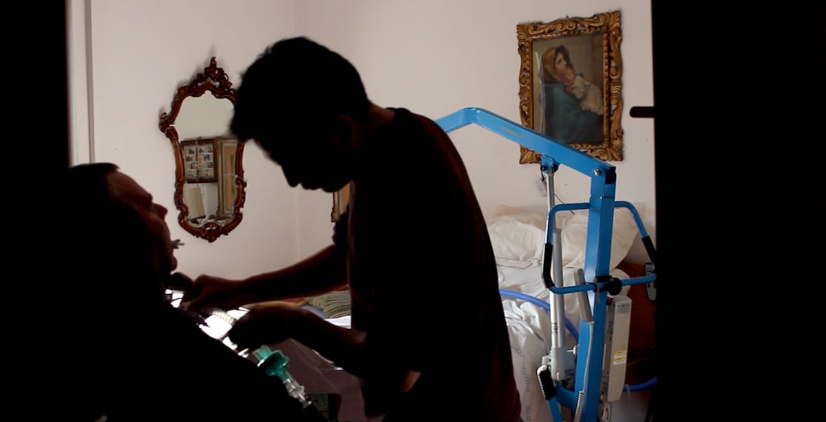 Camden’s award for Emerging Cinematic Vision went deservedly to Laura Viezzoli’s La Natura delle cose (The Nature of Things), a profound end-of-life document of the devoutly-Catholic widower Angelo Santagostino as he succumbs to the immobilizing disease ALS in an Italian nursing home. By the time Laura introduces us to Angelo, he can only move his eyes and twitch his countenance, but the viewer receives his typed-out thoughts through a screen in front of his head — the Eyegaze System by LC Technologies, which monitors Angelo’s concerted points of focus on an alphabetic keyboard. In the opening sequence we can hear Viezzoli directing the positioning of the Eyegaze monitor and Angelo’s body, facing away from the camera, to achieve the effect of seeing only his face in the far-off reflection of a blackened LCD television and his thoughts through the keyboard screen. For most of the film, he is an essence that lives on in screens and the baritone voiceover of actor Roberto Citron, Angelo’s limp body a sacred-but-unwieldy vessel from which death will free him. He ruminates on his beautiful life of communion with his late wife Marinella, who had roused him out of his path toward priesthood, and he explains his own poetic philosophy of ‘millimetric precision’ — reminiscent of ancient Greek atomism — and life after death while grainy images of fireworks exploding and space exploration fill the screen.