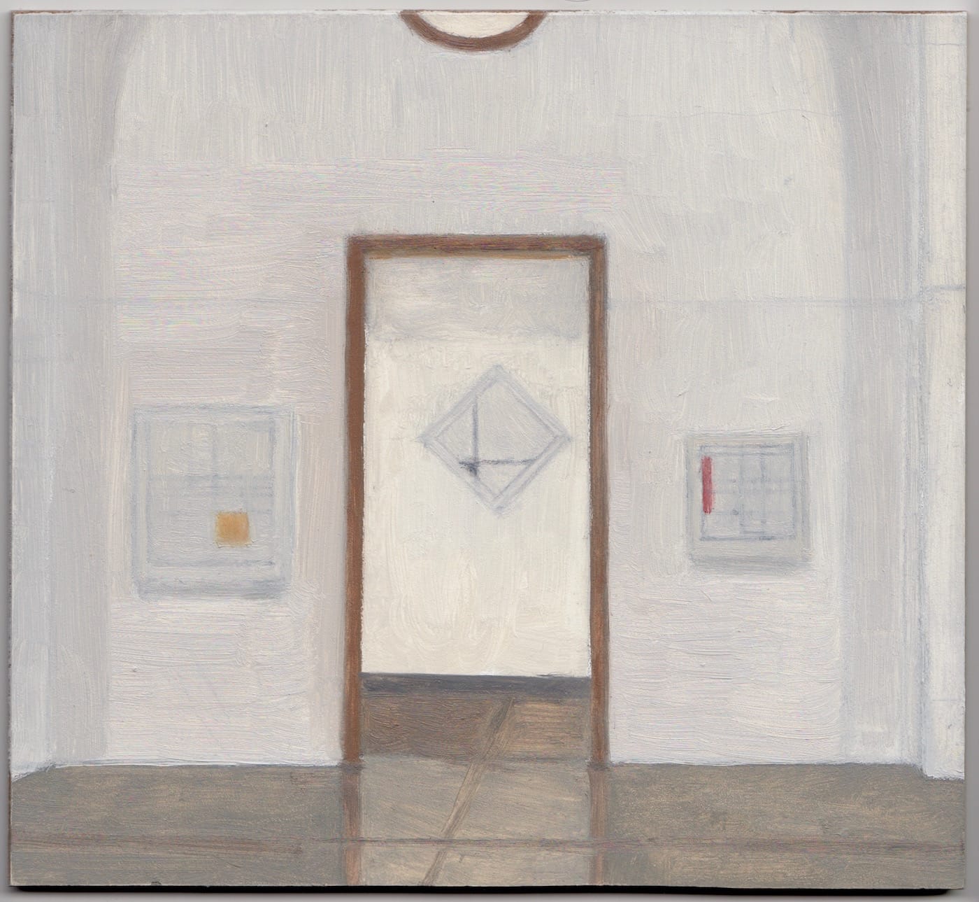 I am an unabashed fan of Eleanor Ray’s modest-sized paintings of interiors and exteriors. In one, “Mondrian’s Room, Philadelphia” (2016), which measures less than seven by eight inches, there is a view of three Mondrians, two on the walls flanking a doorway and a diamond one visible through it, in an interior of the Philadelphia Museum of Art. The sense of symmetry and asymmetry in the composition echoes Mondrian as well as pays homage to him. The dusty gray-white of the museum’s walls creates a counterpoint to Mondrian’s whites, as do the muted red and yellow seen in his paintings.