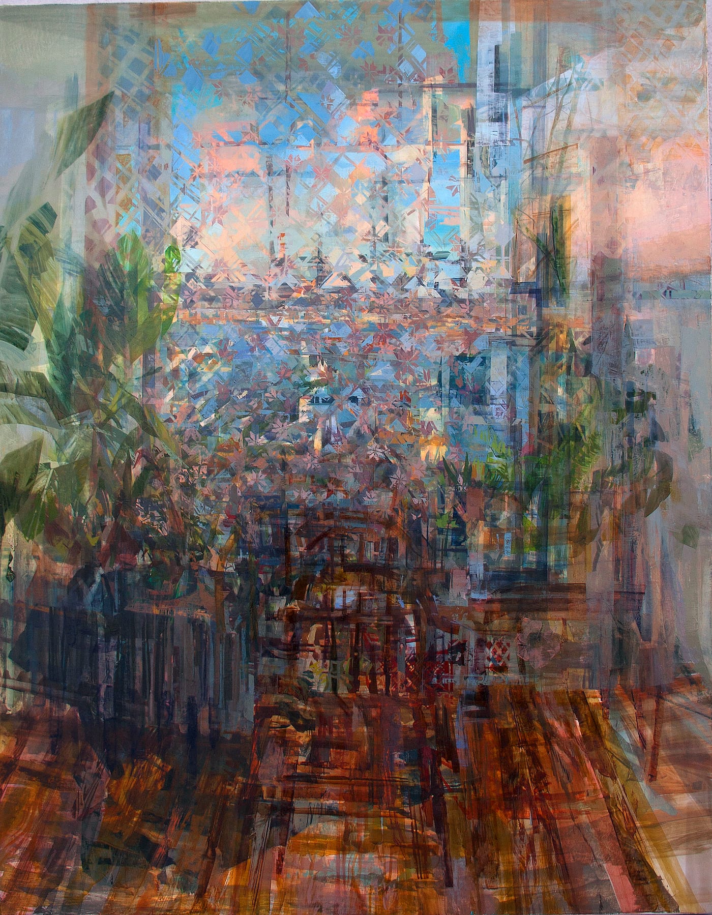 It’s as if we are looking through some kind of window (the picture plane) that has been altered by the semi-transparent lattice. The painting is mesmerizing and ordinary, weird, dizzying, and just plain captivating. We are looking at multiple reflections and echoes compressed together — a discussion between seeing and memory about what we are actually seeing. No one is getting the upper hand in this argument and, if we are lucky, it won’t end any time soon.