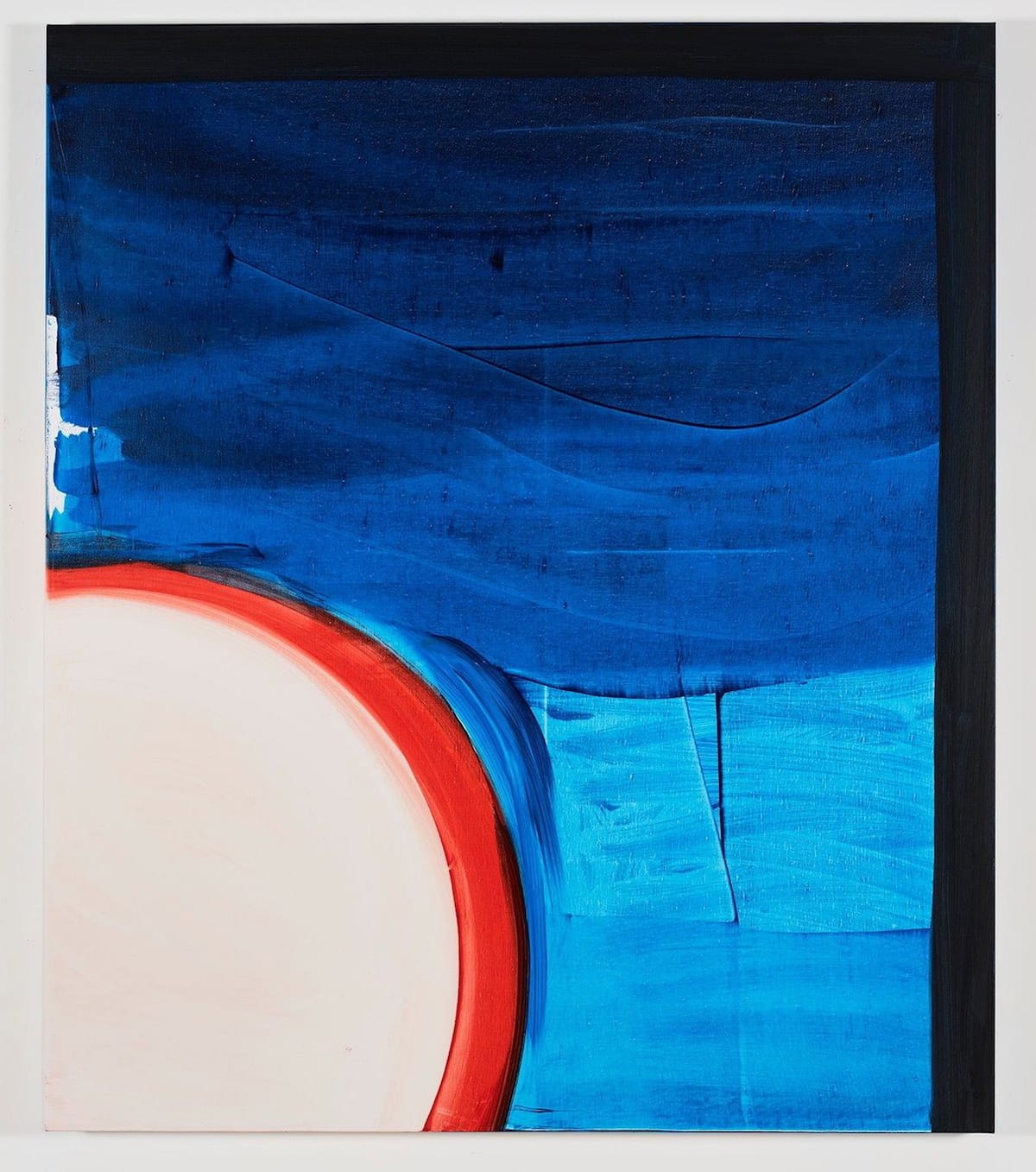 The lower portion of the painting is divided into a red arc bending from the left edge to the bottom, creating an incomplete circle in the painting’s left-hand corner. The interior of the circle is cream-colored with hints of red peeking through. To the left of the arc, the paint is light blue and as tactile as the paint above. I think it is particularly hard to pay homage to an artist, let alone two, and still be yourself, but that is what Belag has done in “After Krushenick After Hokusai.” She has also moved her work into what is for her new territory. There is something moody and evocative about the painting – two states that the art world ought to hold in higher regard.