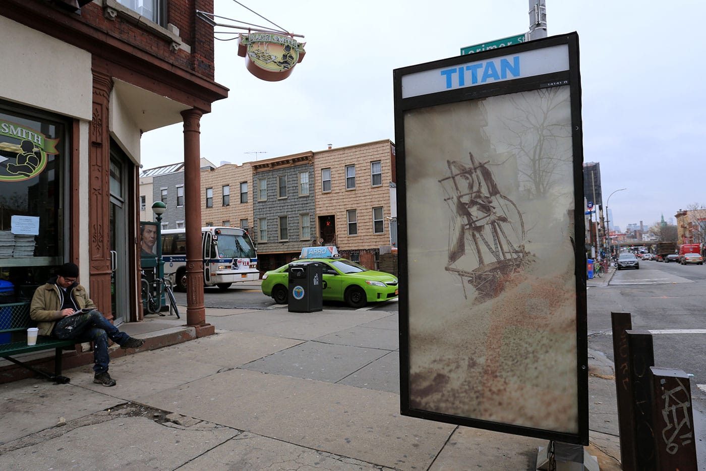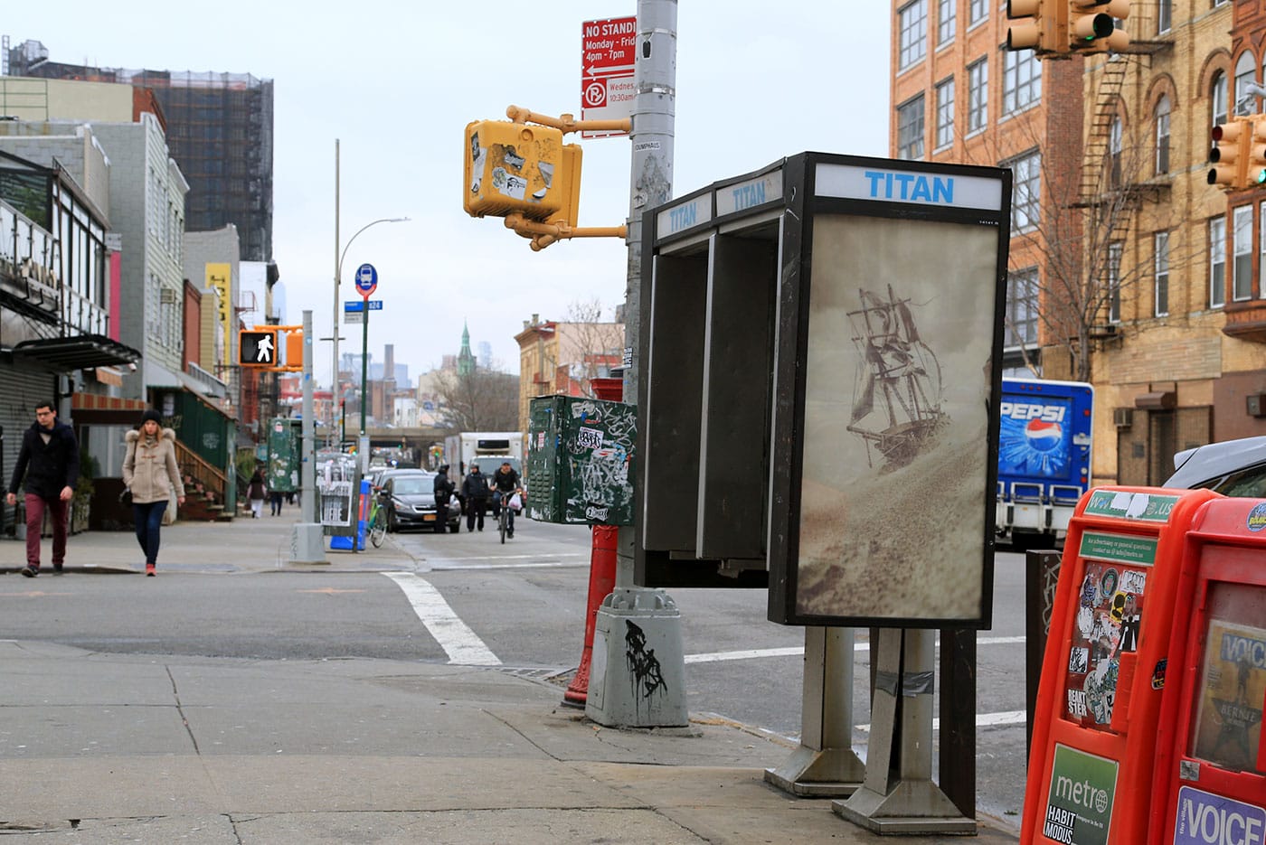The campaign launched Wednesday with a piece by artist Adam Wallacavage installed in a payphone kiosk on Metropolitan Ave and Lorimer St in Williamsburg, Brooklyn. The work reads as a vintage sepia photo of a pirate ship sailing on stormy seas, but it’s actually a heavily filtered iPhone photo of a small model ship floating on the Jersey Shore. “I like the idea of someone seeing my piece and wondering what they’re supposed to be buying or where the nonexistent punchline is,” Wallacavage says. The image is part of his Shipwrecks of Unicorn Beach series, which stars model ships found at yard sales and which the artist describes as “a play on using modern camera phones to mimic antique film cameras.”