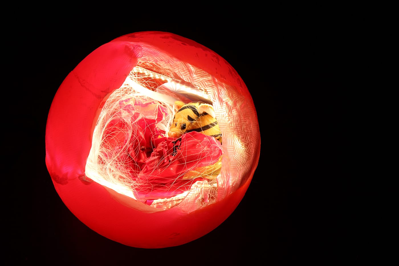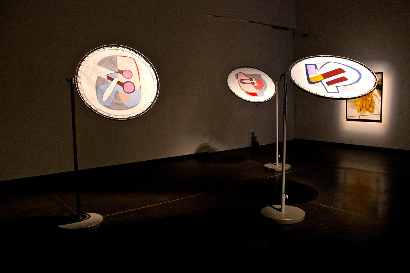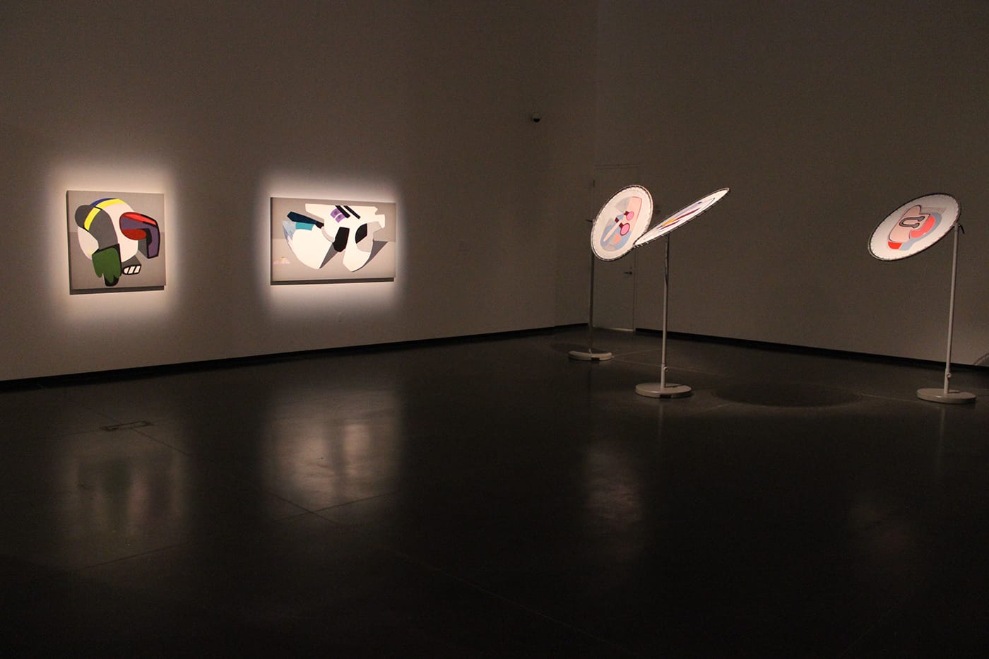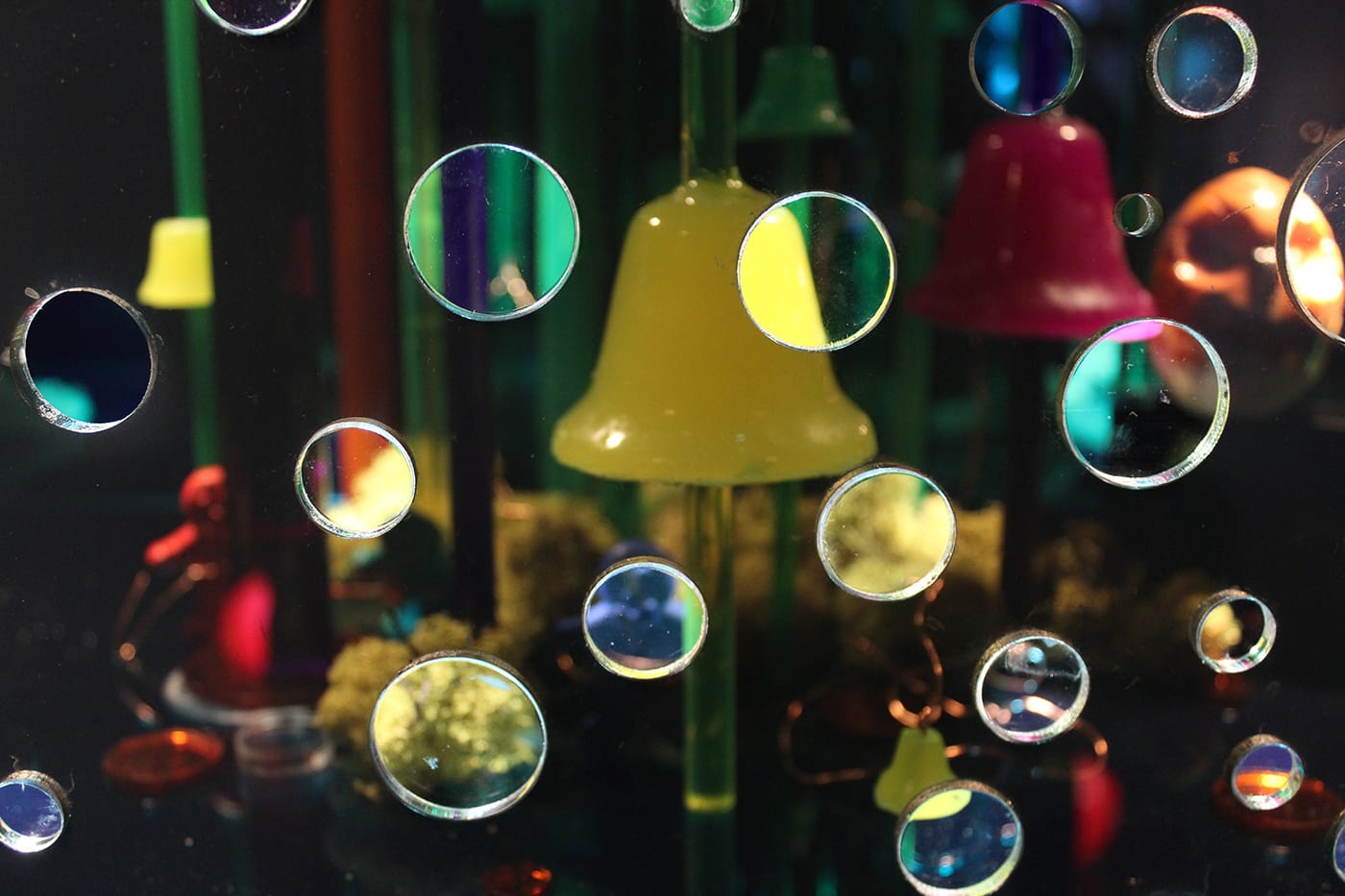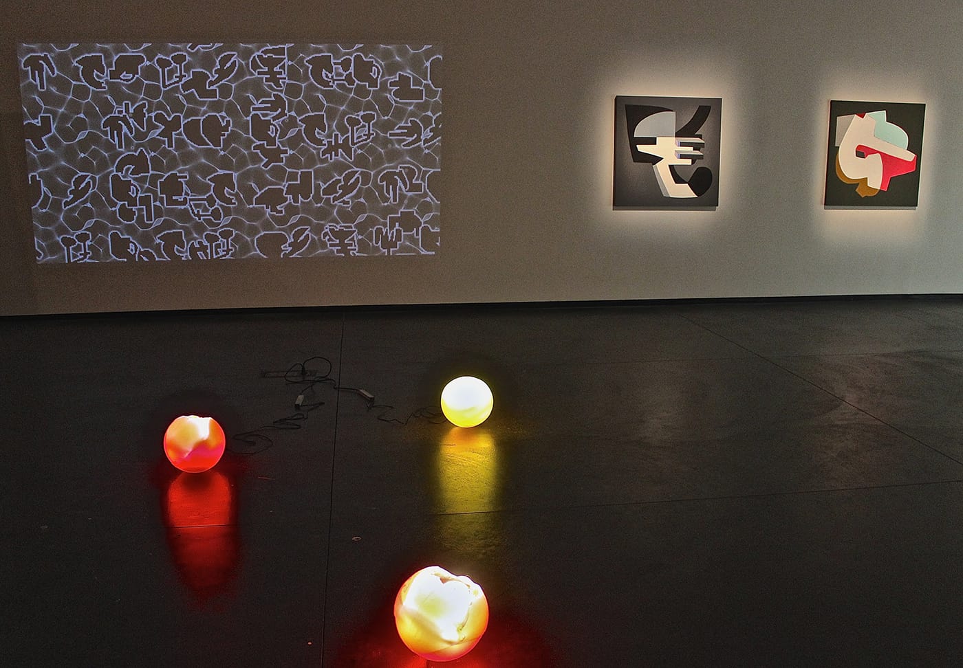 What worlds exist within the sprawling Albertine Monroe-Brown Gallery? There are little worlds, like the intimate, playful terrariums of Ajay Kurian, which host childish ephemera — plastic toys, sparkly pipe cleaners, and LED lights — inside cast-resin balls or a fish tank-like enclosure. There are also symbolic worlds, like the intermedia works of Hayal Pozanti, which parlay data points and statistics into an alphabet of the artist’s own invention, dubbed “Instant Paradise.” The results come in the form of digital animations, paintings, and sculptures — some display individual “letters” (resembling a kind of modern art kanji, or other Eastern language characters) on stretched, round canvases, called “sun shades,” sculpted out of roughly textured polystyrene foam, calcium carbonate, acrylic polymer, and acrylic paint — all of which evoke a sense of alien artifact.