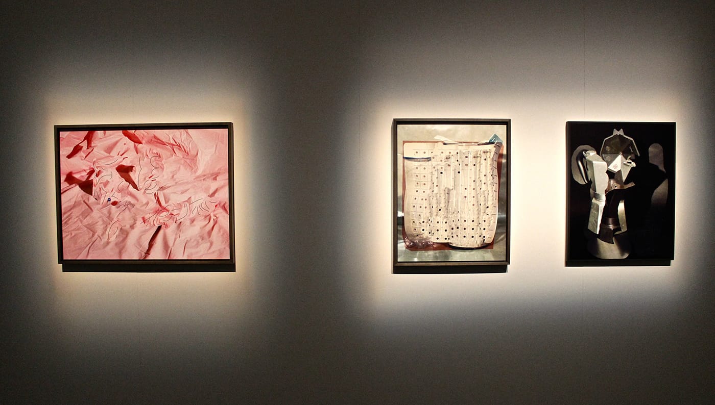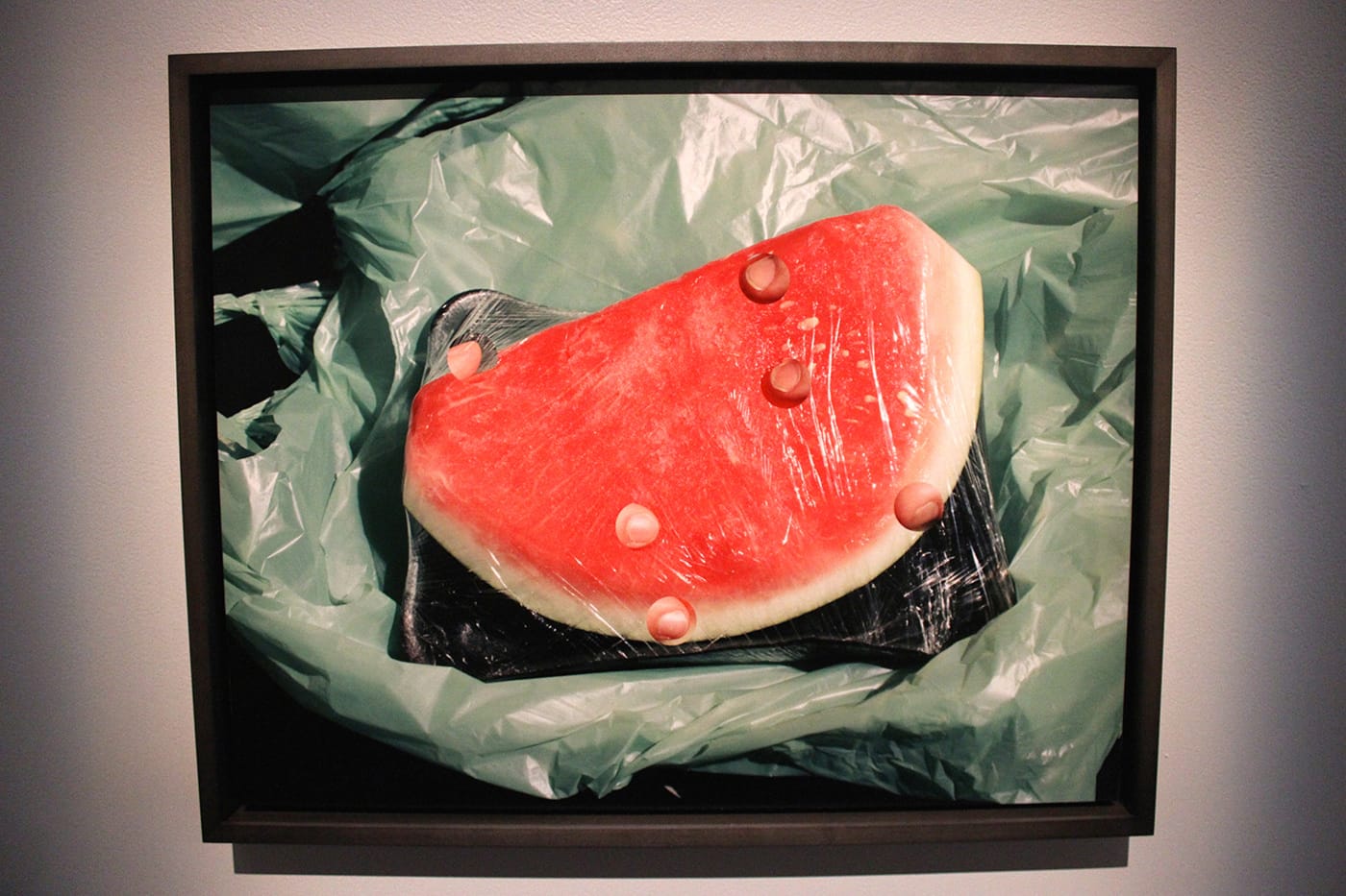 This pairs with another body of highly mediated worlds, as conveyed in Lucas Blalock’s photographs, which show visible Photoshop interventions into staged tableaus of domestic objects. According to the artist’s statement, the work is intended as a critique of the “widespread use of digital tools to retouch photographs for commercial and corporate purposes.”