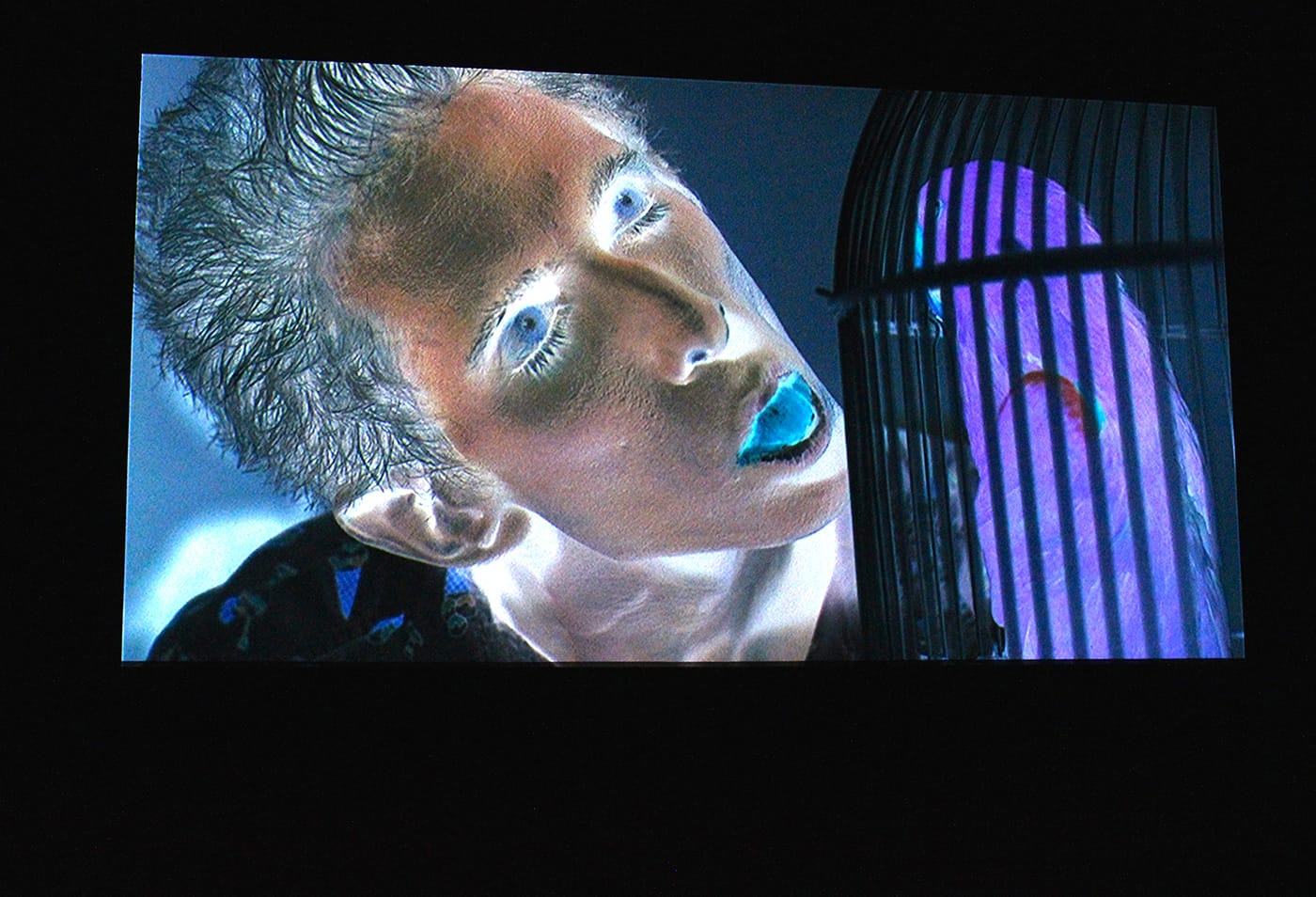 Inverted worlds, like Ben Hagari’s 11-minute 35mm film (transferred to HD video), display the artist’s surroundings in negative colors. An inkjet print captures one of the film’s subjects, a caged parrot — both the subject and spectrum of the image lend a feeling of being trapped. He has also “inverted” a light bulb by spray painting it black, casting a blotch of black light onto the white surface of the gallery wall.