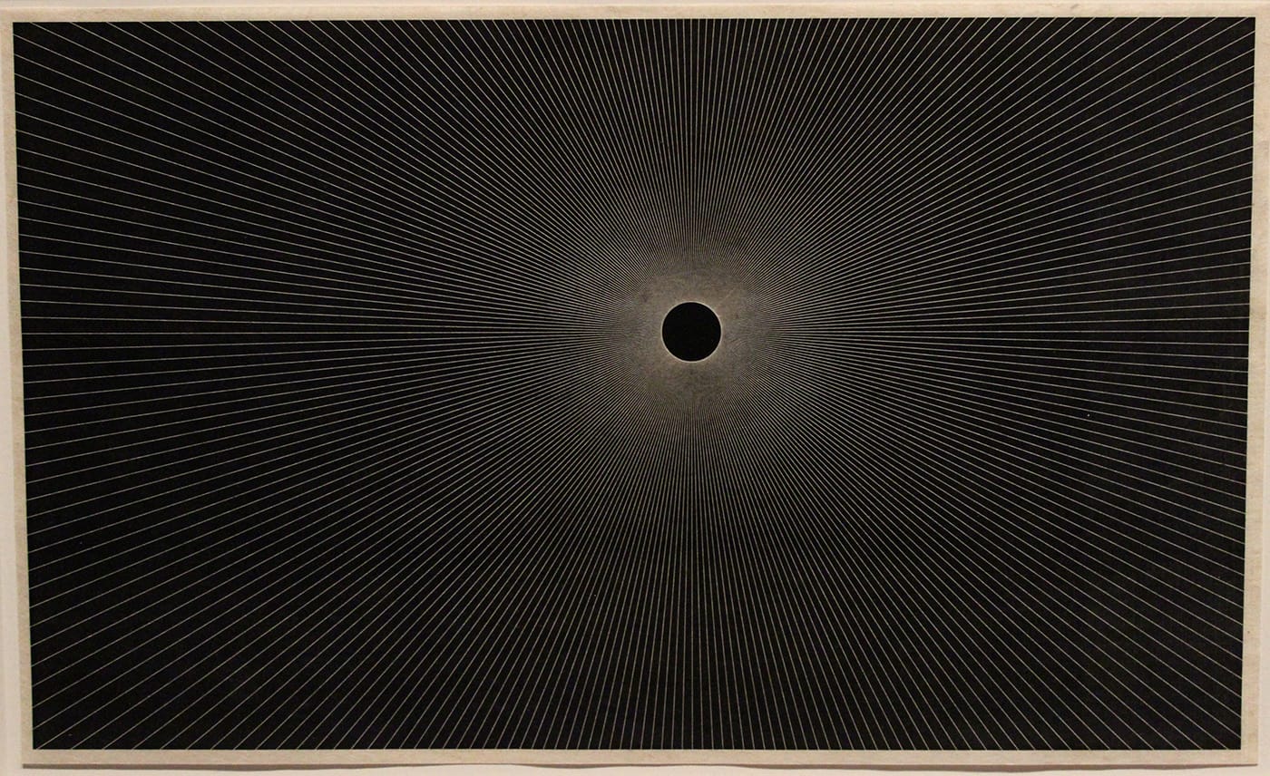 Marsha Cottrell is interested in how we observe our environments through screens and lenses. She creates telescoping worlds in repetitive monochrome works on paper where she has printed and reprinted layers upon layers of geometric shapes, creating a buildup of ink into fuzzy paper substrates.