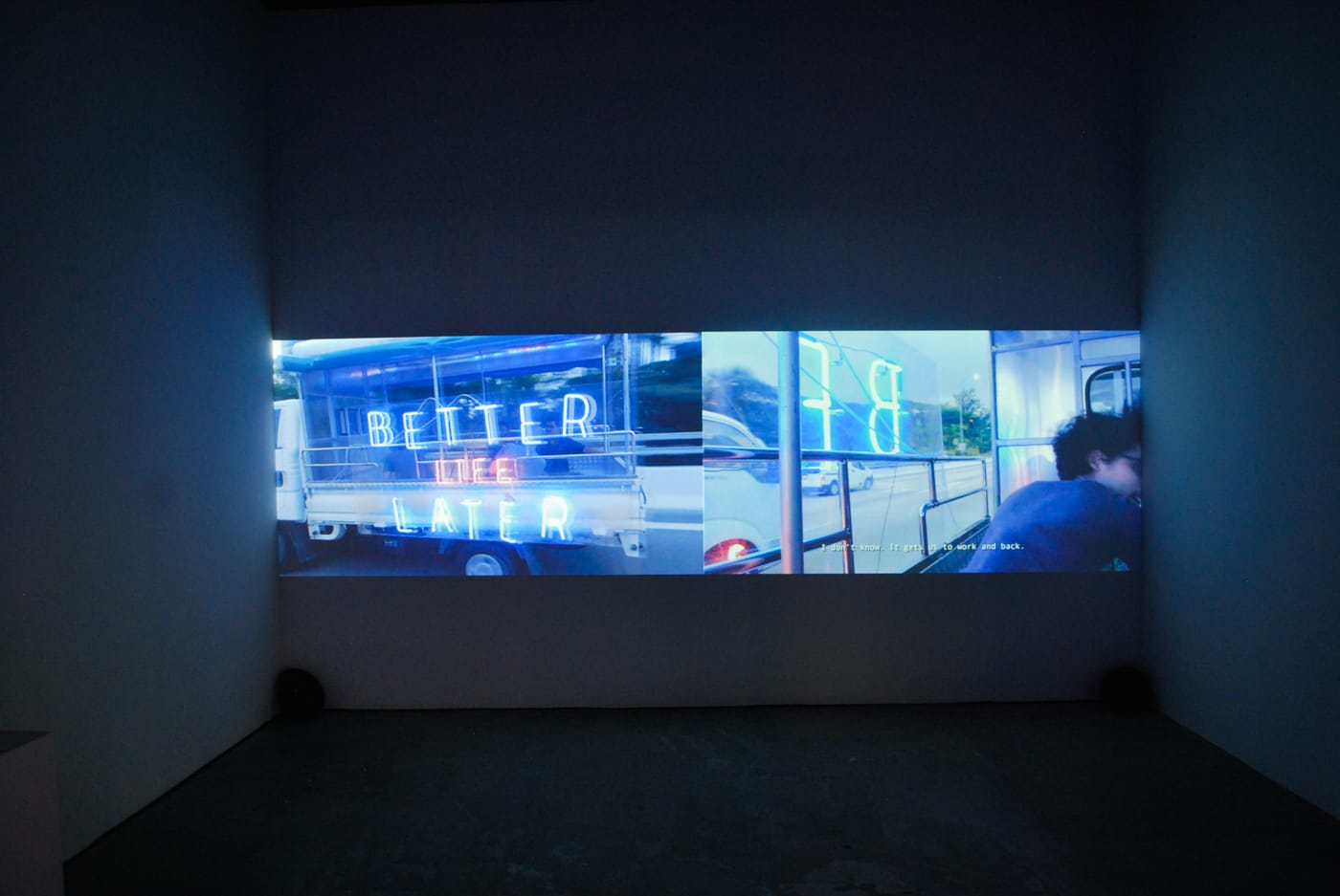 What the facts failed to tell, I ironically (or perhaps spectacularly?) found glimpses of in a few artworks in Net Present Value: Art, Capital, Futures. “If Not, Accelerate,” (2016) is a two-channel video by Kent Chan, where we see two men silently riding across Singapore in the back of a truck from one side of Singapore to the other, near their dormitories. The other channel, shot simultaneously from outside the truck, reveals the two men filming. The side of the truck is outfitted with neon lights reading “Better Life Later,” which is part of the installation “Bright Lights (Better Life Later)” (2016), also found in the darkened room, facing the video projection.