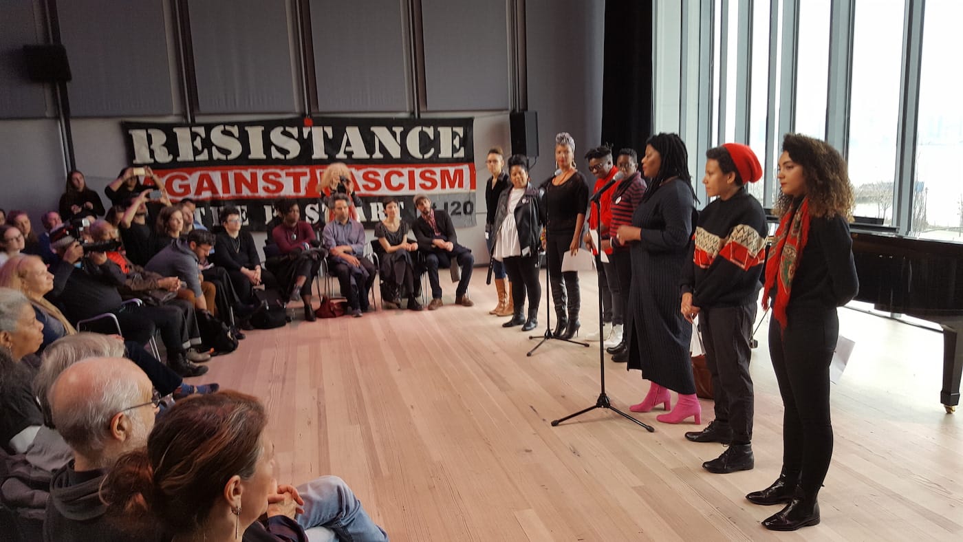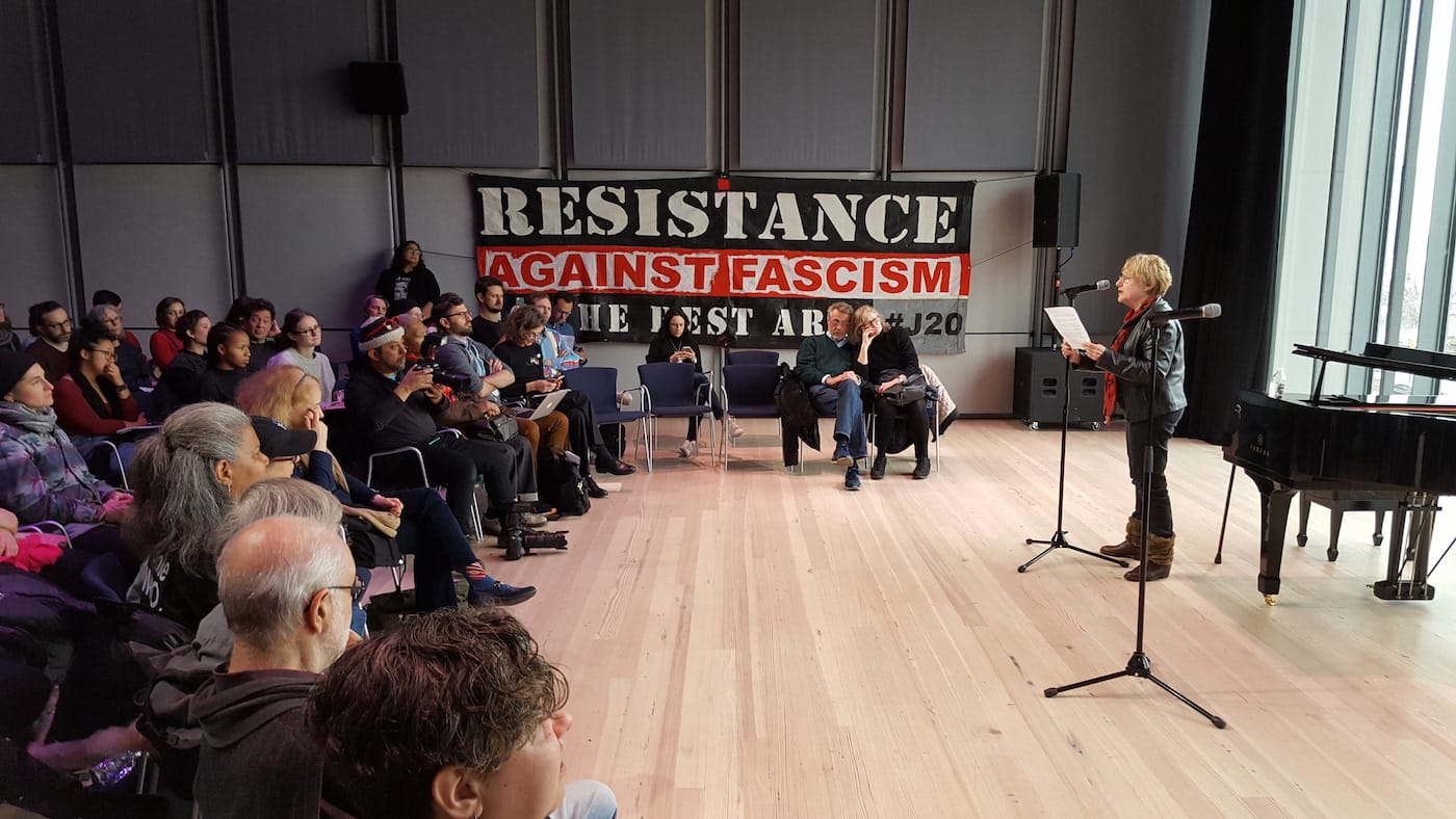 It was as if everyone knew what was about to happen and agreed that hate-watching the sham pageantry of the inaugural wouldn’t change anything, and would likely only make things feel worse. Instead, those present decided to commit themselves to a different kind of event, one grounded in acknowledging the coexistence of many intense and difficult emotions. This was as true of the speakers — a highly diverse group of about 30 artists, activists, arts professionals, and critics — as it was of the audience, which included a number of walk-ins, and ranged from students and organizers to tenured professors and Whitney staffers.