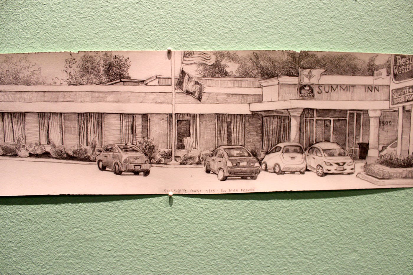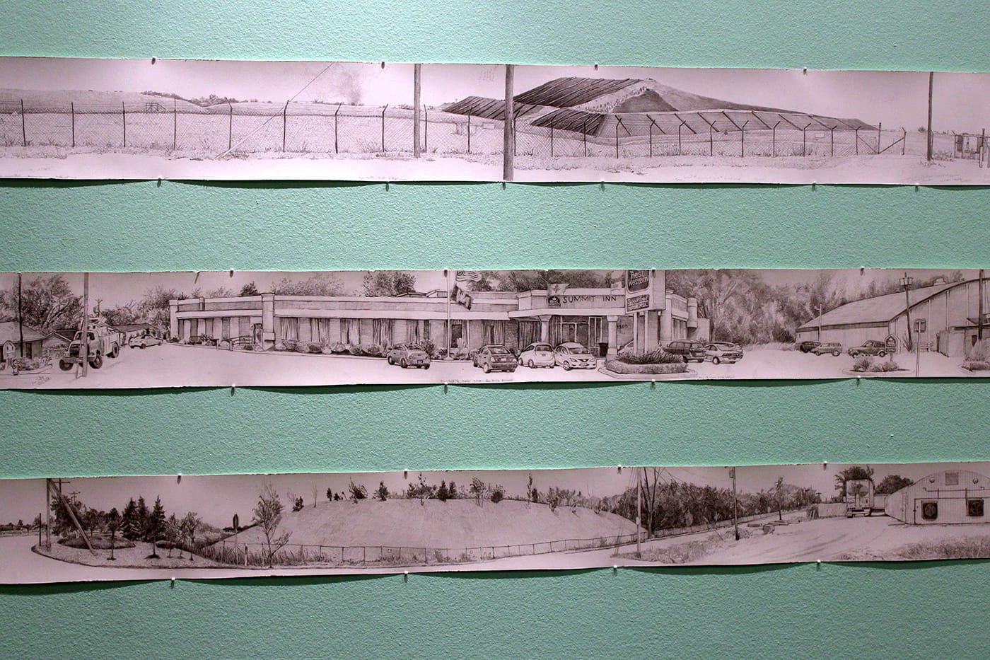 “Many roads and parking lots in Niagara Falls have radioactive slag, waste from the Manhattan Project, mixed into the road beds and under the backfill of the parking lots,” Linder told Hyperallergic over email. “Rapids Bowling and Greater Niagara Building Center are well-known hot spots.” Linder’s detailed pencil panoramic drawings underscore the innocuous and quotidian nature of these landscapes and locales, and the ways in which an unknowing public is constantly exposed to their effects — on your toxic sites getaway, be sure to stay at the apparently radioactive Niagara Falls Best Western Summit Inn!
