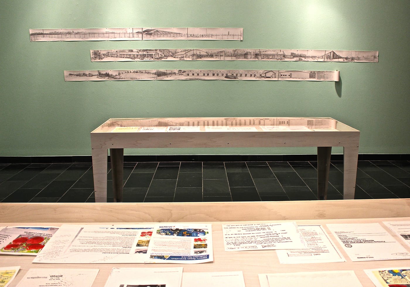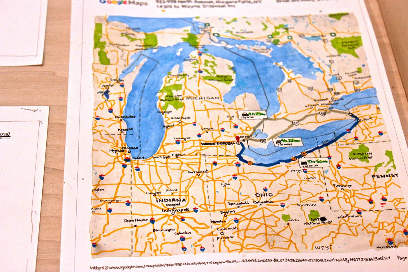 Linder’s project is a series of 135 drawings, to date, collectively titled Toxic Archives 2013–present. Materials include long scrolls that feature hand-drawn, panoramic views of affected areas in Buffalo, Niagara Falls, and, in the project’s most recent iteration, the US Ecology landfill at Willow Run Airport in Bellville, Michigan. Linder was initially inspired by her interest in the Love Canal disaster in Niagara Falls, wherein an entire neighborhood development was built on toxic ground, impacting the health of hundreds of residents. Outcry about the situation peaked in the late 1970s, resulting in a Superfund cleanup that concluded with the neighborhood’s demolition in 2004.