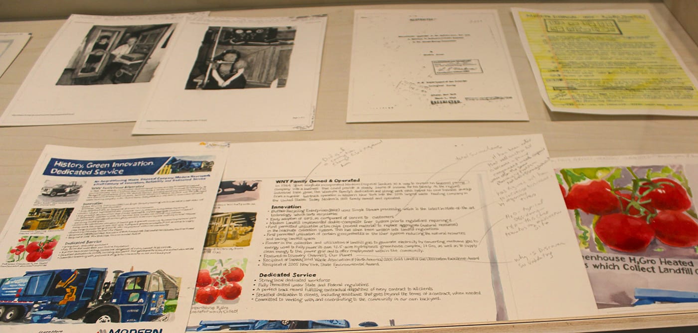 “If you look, you find continuously that schools, ball fields, parks — all of these things tend to be built in proximity of the nastiest sites,” Linder says in the video. “So none of that has really changed.” On display in Atomic Highways and Byways are three of Linder’s panoramic scrolls, several display cases full of research materials (painstakingly re-rendered by hand), and a rubbing taken from a radioactive parking lot on Niagara Falls Boulevard.