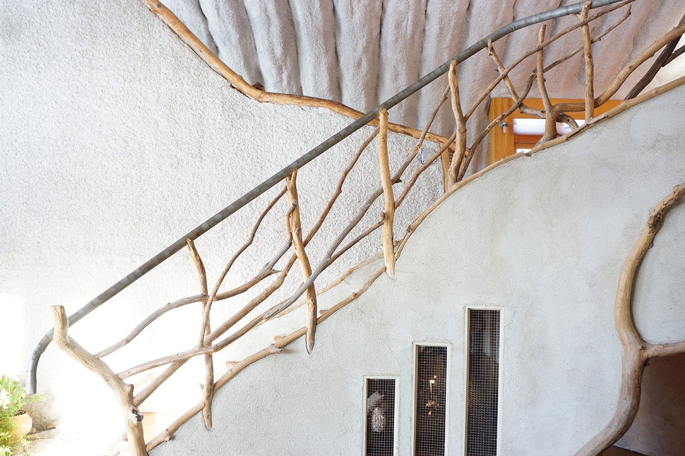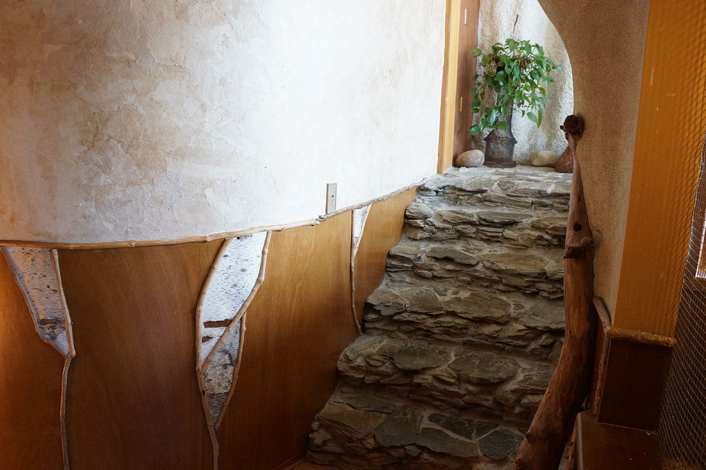 In her home, this awareness is demonstrated in the way she’s used the built environment to highlight the natural one. Nothing feels predetermined; everything is fluid and irregular, keeping your eyes in motion and your ears perked. Birds call out, a dog rustles, quiet splashes in a small indoor pool alert you that fish are navigating the same space that you are. The overall impact is one of liveliness. Each element that your eyes or mind encounter is calming, but your mind is never allowed to fall into the habit of predicting what will happen next and then tuning out. The patterns and surfaces keep you present in a way that blank white walls never could. You don’t shut down. When the walls, floors, stairs, handrails, doorbell cover, and living creatures all call for your presence, staying present begins to feel much more important than it does when you see a prompt on a coffee mug.