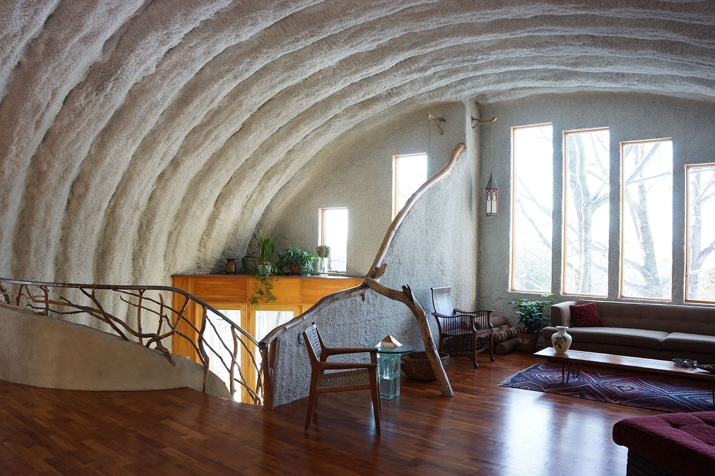 An unexpected visit to Linda Weintraub’s homestead in Rhinebeck, New York, jogs my memory of those earlier visions of what home could mean: curving, textured walls punctuated by bursts of organic material; wholly original landscape features; and a soft blurring of the boundaries between domestic space and the natural world. The value of my childhood wish for home to mean not only earthy womb or cozy cave but also, more importantly, a space tailored to the individual and context, became obvious when I stood in her living room for the first time.