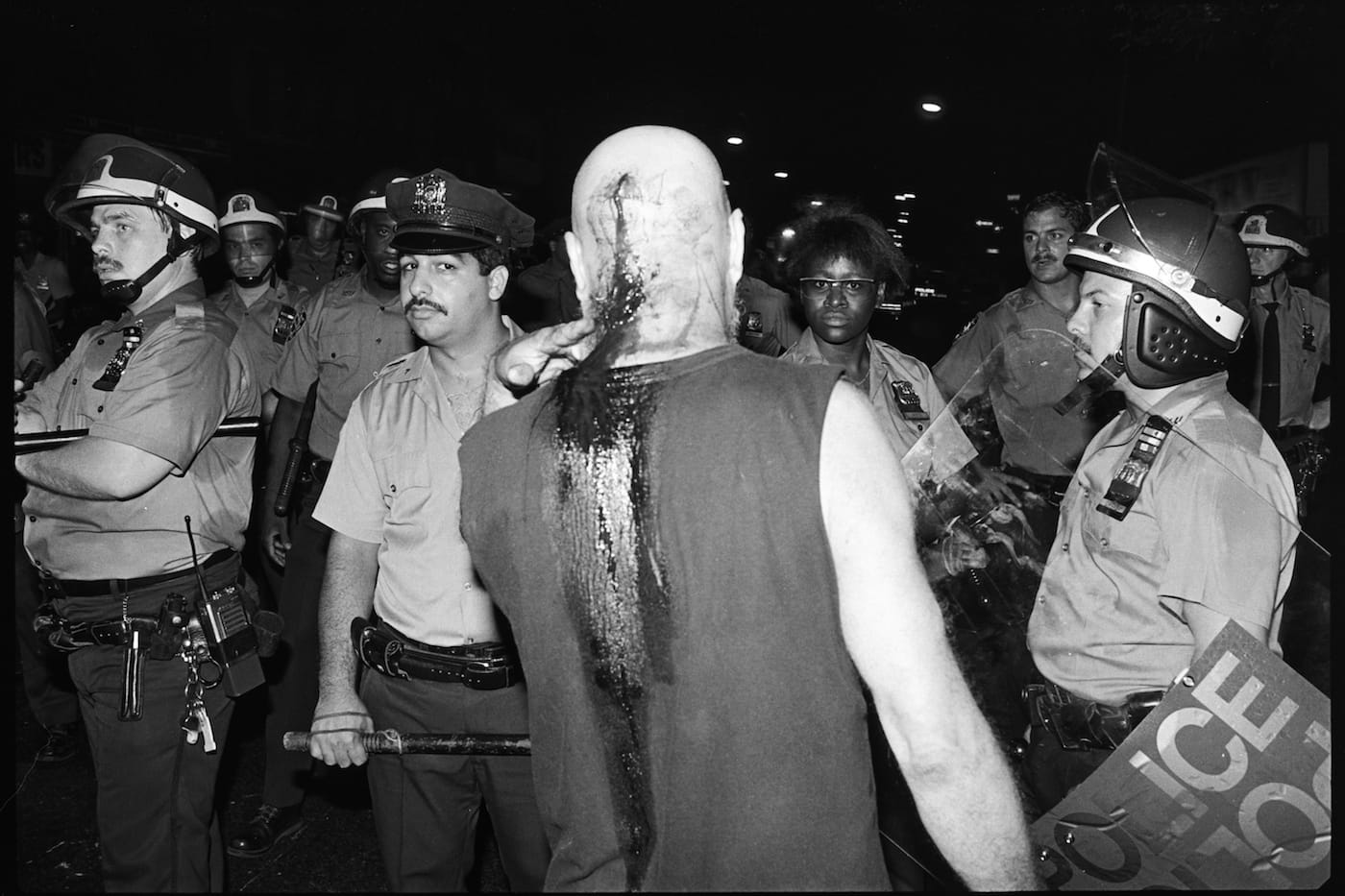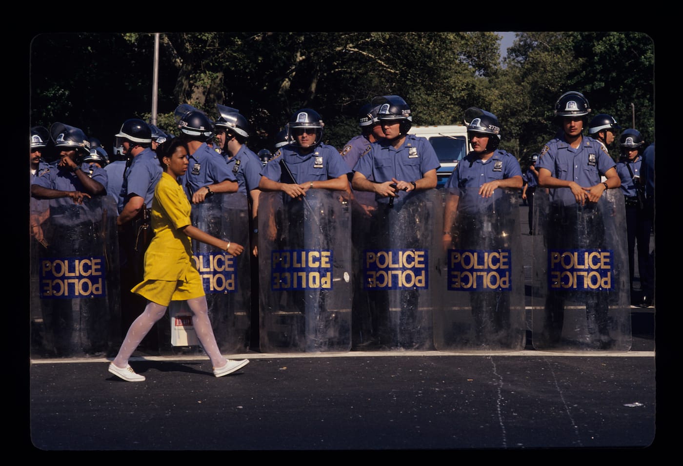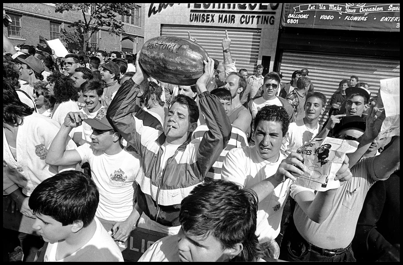 In a photo by Mark Peterson from just after the riots, a woman in a yellow dress walks by a row of police officers clad blue uniforms, hiding behind clear shields with the word “police” in block letters across them (as if anyone could mistake them for anything else). Peterson captured the woman mid-stride, the color of her dress like defiant sunshine against the uniform darkness of the officers. In another image from the same year by Ricky Flores, an anti-racism march in Canarsie organized by Rev. Al Sharpton was met with mobs of white residents throwing watermelons. In this photo, a man is smoking a cigarette, his eyes closed in seeming ecstasy, as he holds the fruit above his head like a soccer ball.