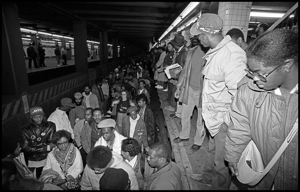 On a crowded rush-hour subway platform, Ricky Flores captures a man in a baseball cap as he cranes his neck toward the tunnel in a pose straight out of an urban fairytale: Someday my train will come. Below him, scores of New Yorkers fill the tracks, two and three and four across, blocking a Brooklyn subway from entering the station. They look downward and upward, anywhere but toward the camera, as they put their bodies on the line, disrupting train service. Their actions were part of a Day of Outrage in protest of the killing of Michael Griffin, a black man who was hit by a car in Howard Beach, Queens, after being chased by a white mob that objected to his presence in a pizza shop in the early morning of December 20th, 1987.